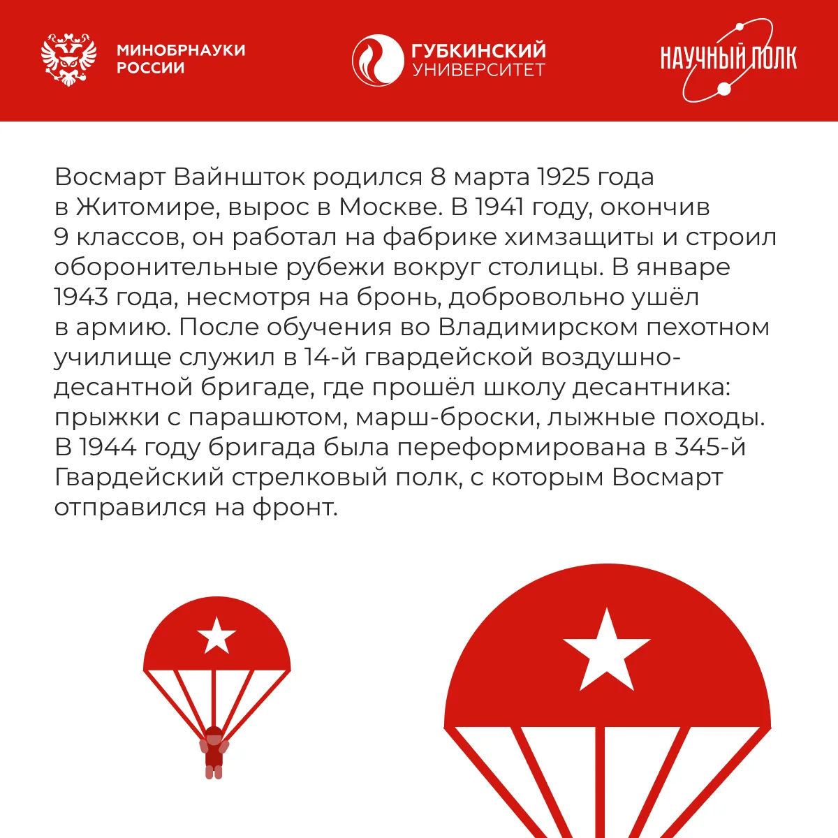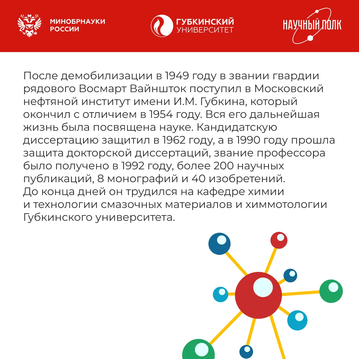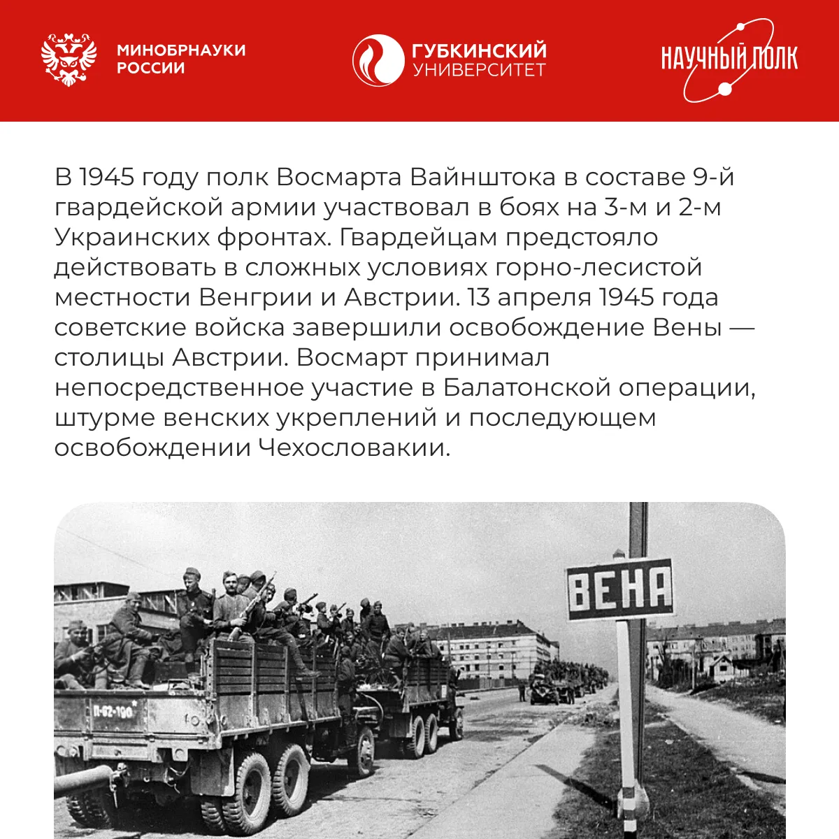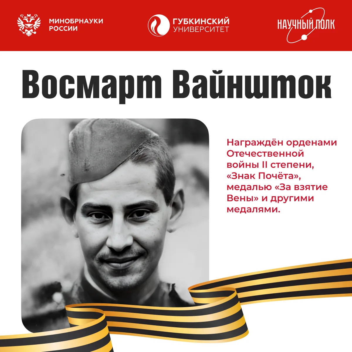 🔹 Восмарт Вайншток — боец 345-го гвардейского стрелкового полка, участник Балатонской операции и штурма Вены, впоследствии доктор технических наук, профессор кафедры химии и технологии смазочных материалов ГАНГ имени И.М. Губкина.