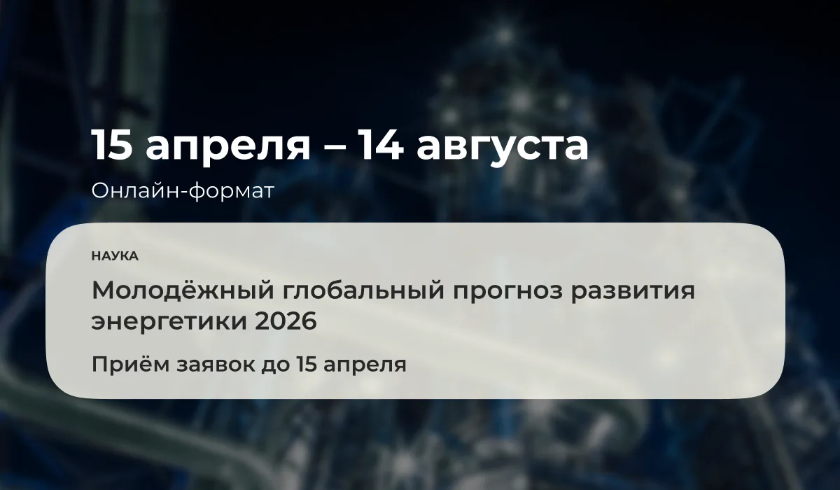 С 15 апреля по 14 августа 2026 года в дистанционном формате пройдёт Молодёжный глобальный прогноз развития энергетики 2026, где команды смогут представить научно обоснованный прогноз развития энергетики до 2035 года. Приём заявок открыт до 15 апреля 2026 года.