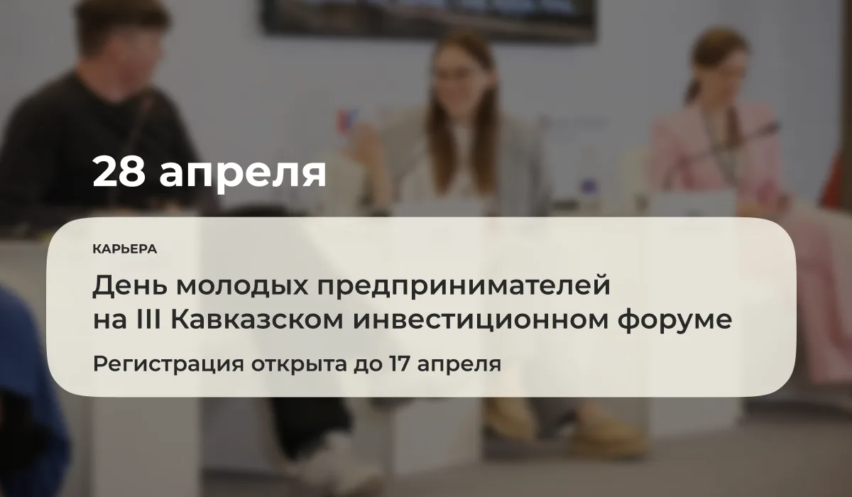 28 апреля 2026 года в рамках III Кавказского инвестиционного форума, площадки для демонстрации достижений регионов России и презентации перспективных инвестиционных проектов, состоится День молодых предпринимателей. Регистрация открыта до 17 апреля 2026 года.