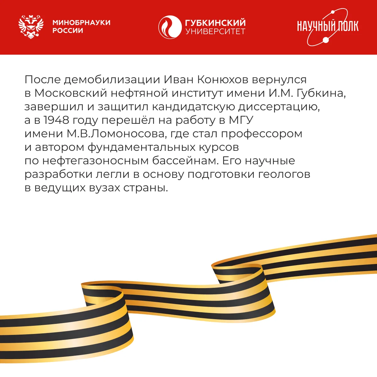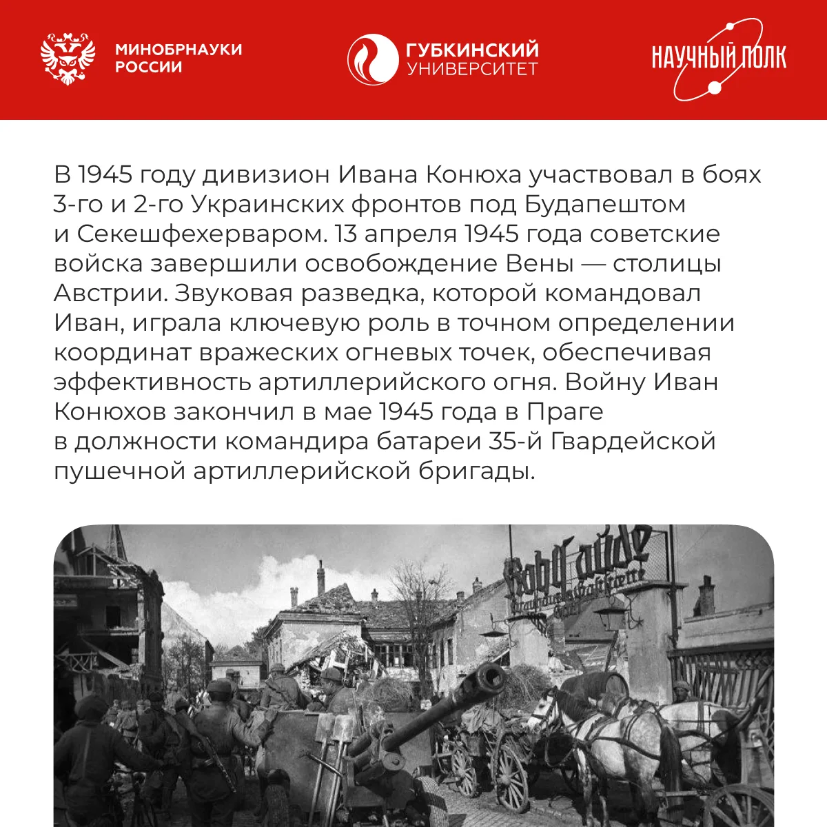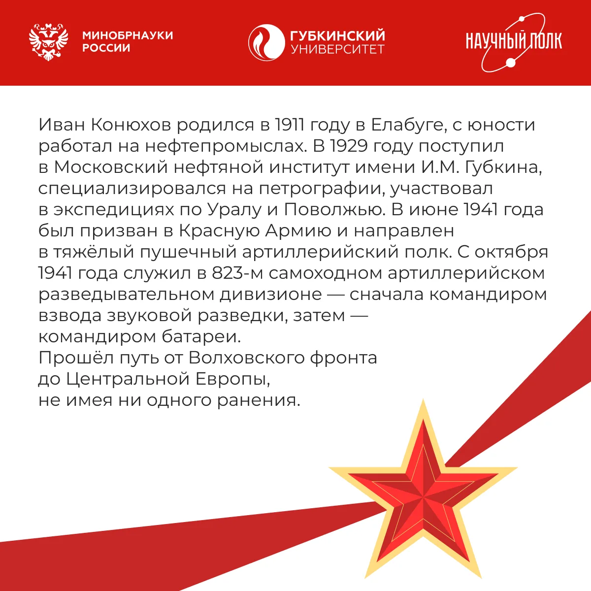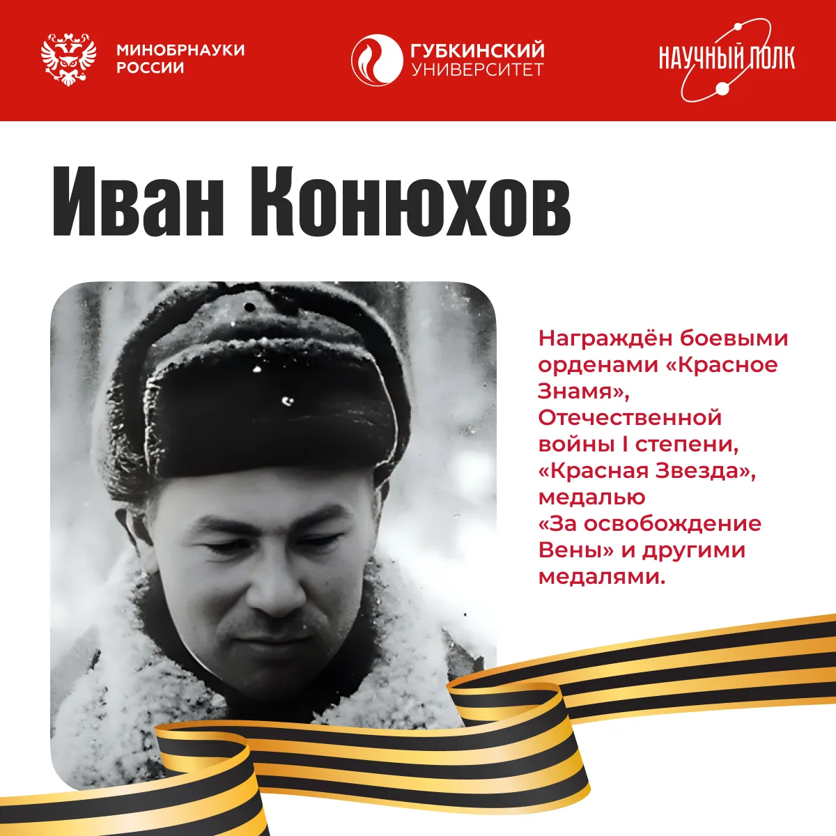 🔹 Иван Конюхов — командир батареи звуковой разведки 345-го гвардейского стрелкового полка, участник боёв на 3-м и 2-м Украинских фронтах, выпускник Губкинского университета, впоследствии профессор кафедры геологии МГУ имени М.В. Ломоносова.