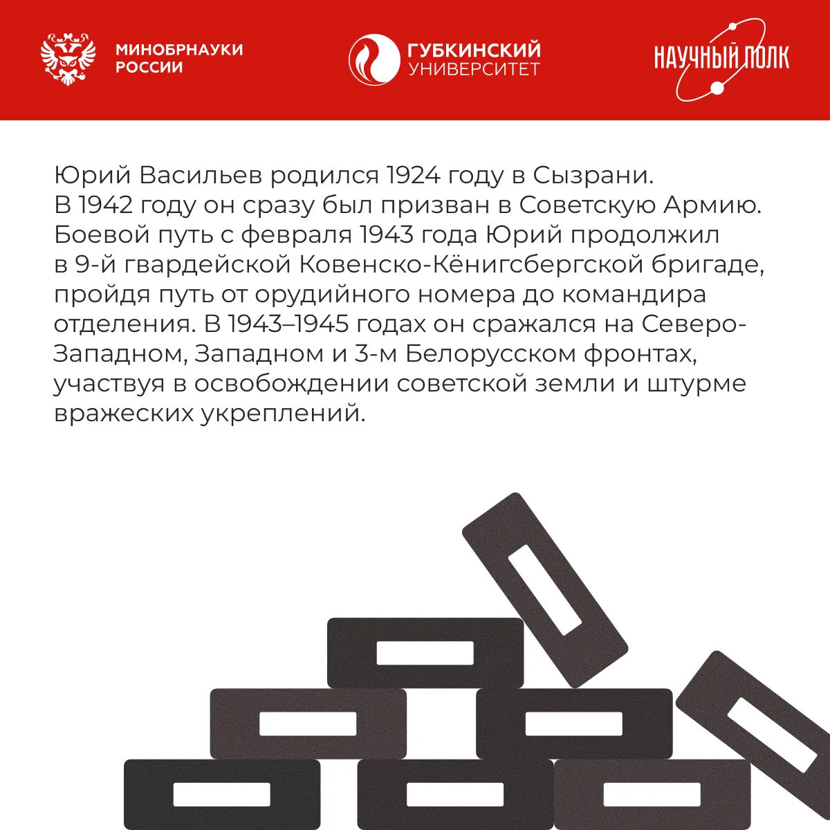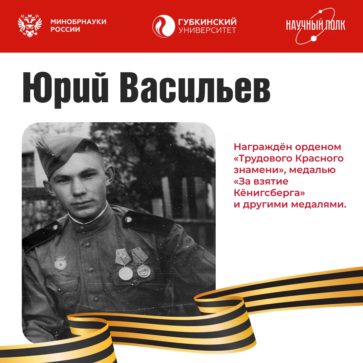 🔹 Юрий Васильев — гвардейский миномётчик, прошедший путь от Северо-Западного фронта до Кёнигсберга, доктор геолого-минералогических наук, профессор кафедры общей геологии