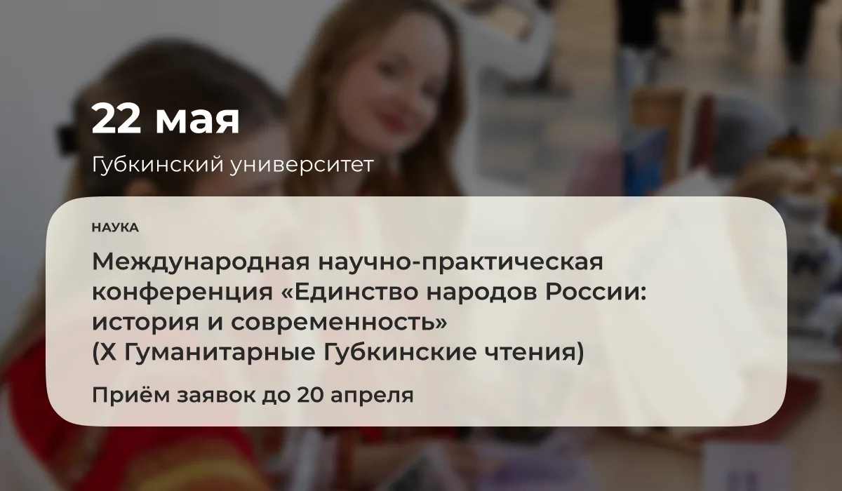 📅 22 мая 2026 года в РГУ нефти и газа (НИУ) имени И.М. Губкина состоится Международная научно-практическая конференция «Единство народов России: история и современность» (Х Гуманитарные Губкинские чтения), посвящённая Году единства народов России. Приём заявок продлён до 20 апреля 2026 года.