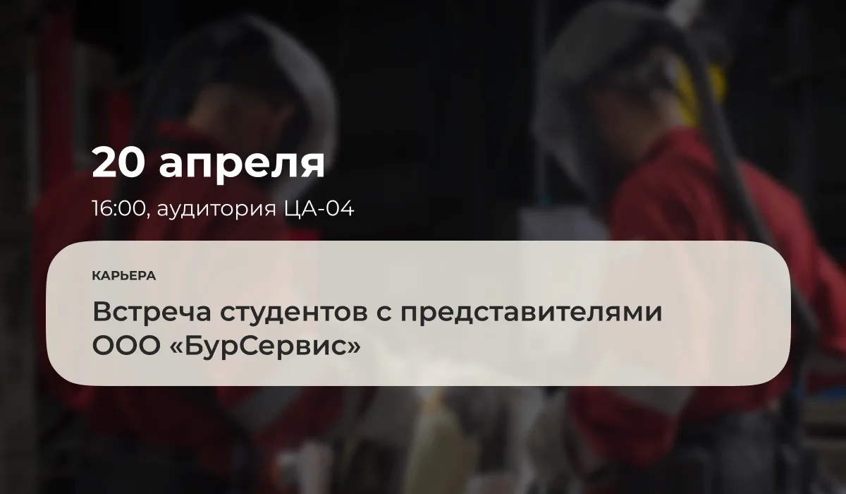 20 апреля 2026 года в 16:00 в аудитории ЦА-04 состоится встреча студентов с представителями ООО «БурСервис». Приглашаются студенты и выпускники всех направлений подготовки.