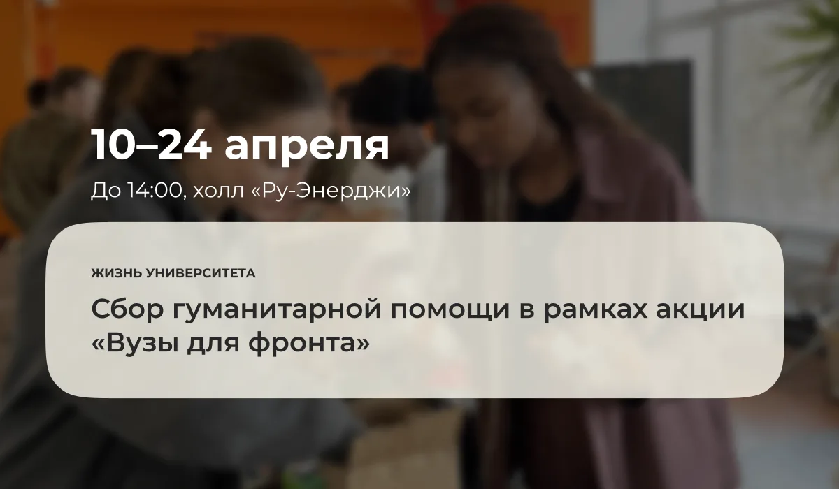 📦 С 10 апреля до 24 апреля 2026 года (до 14:00) в холле «Ру-Энерджи» будет проходить сбор гуманитарной помощи в рамках акции «Вузы для фронта».