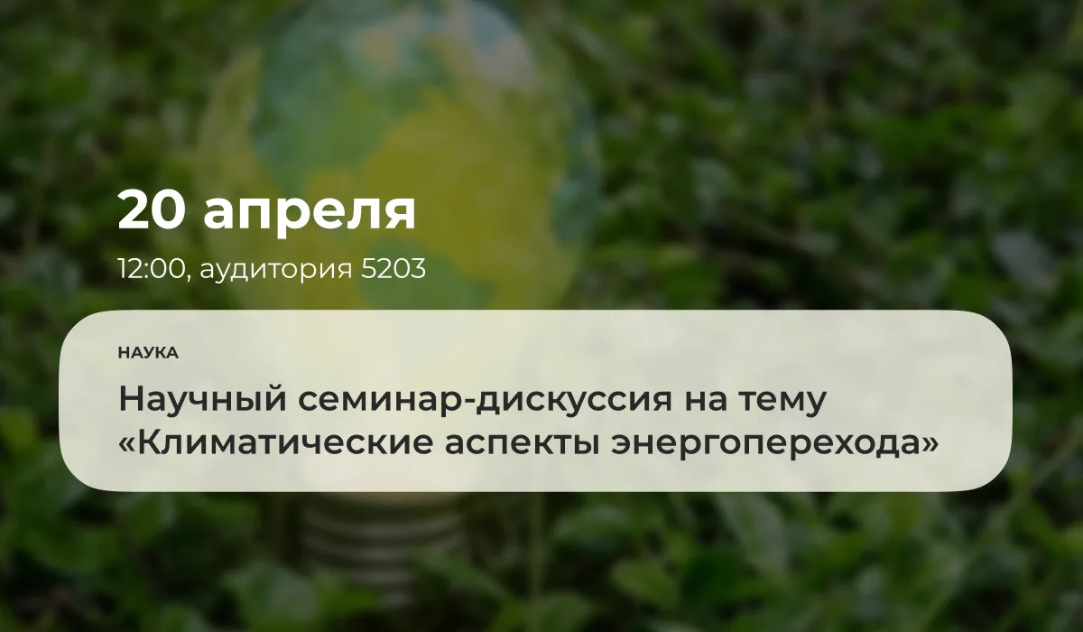 20 апреля 2026 года в 12:00 в аудитории 5203 будет проходить научный семинар-дискуссия на тему «Климатические аспекты энергоперехода». К участию приглашаются преподаватели, студенты, аспиранты, докторанты и все заинтересованные в актуальной повестке мировой энергетики и экономики. Вход свободный.