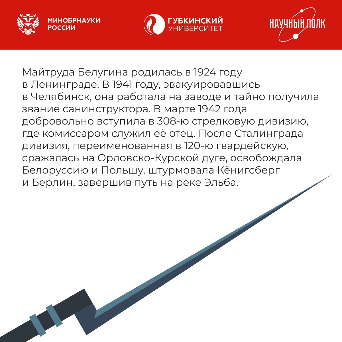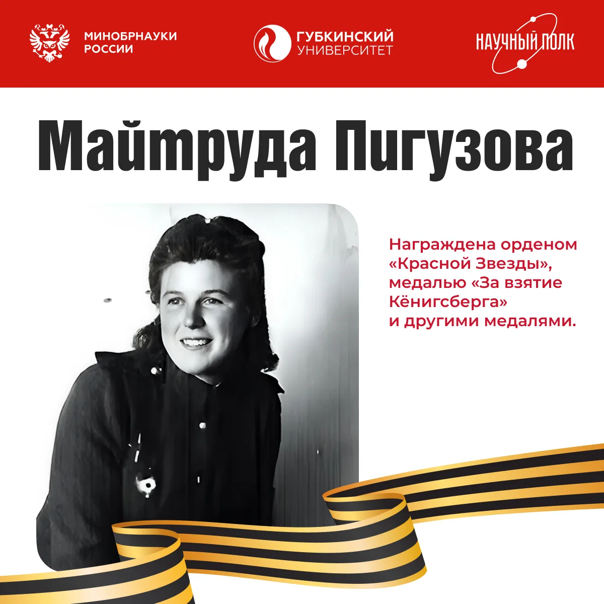 🔹 Майтруда Пигузова (Белугина) — санинструктор 120-й Гвардейской стрелковой дивизии, кавалер ордена Красной Звезды, заведующая парткабинетом института