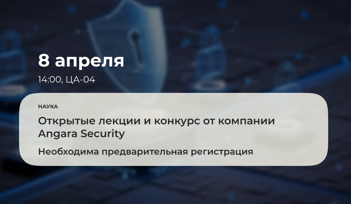 8 апреля 2026 года в аудитории ЦА-04 в 14:00 студенческое научное общество факультета комплексной безопасности ТЭК организует лекцию и мастер-класс от компании Angara Security. К участию приглашаются все студенты, интересующиеся кибербезопасностью и современными технологиями. Количество мест ограничено.