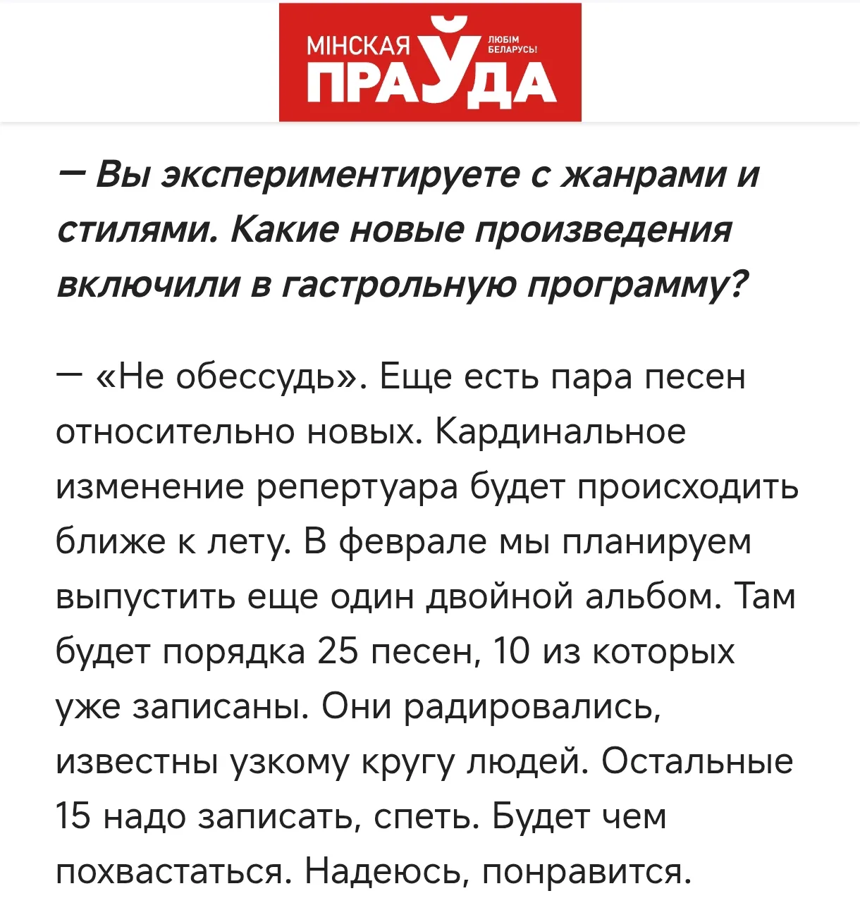 Перед недавним концертом в Минске, дал небольшое интервью «Минской правде». Почитать можно по ссылке: https://mlyn.by/13112025/bog-reshil-chto-ya-eshhe-nuzhen-leps-o-spasenii-i-rabote-na-predele-sil/