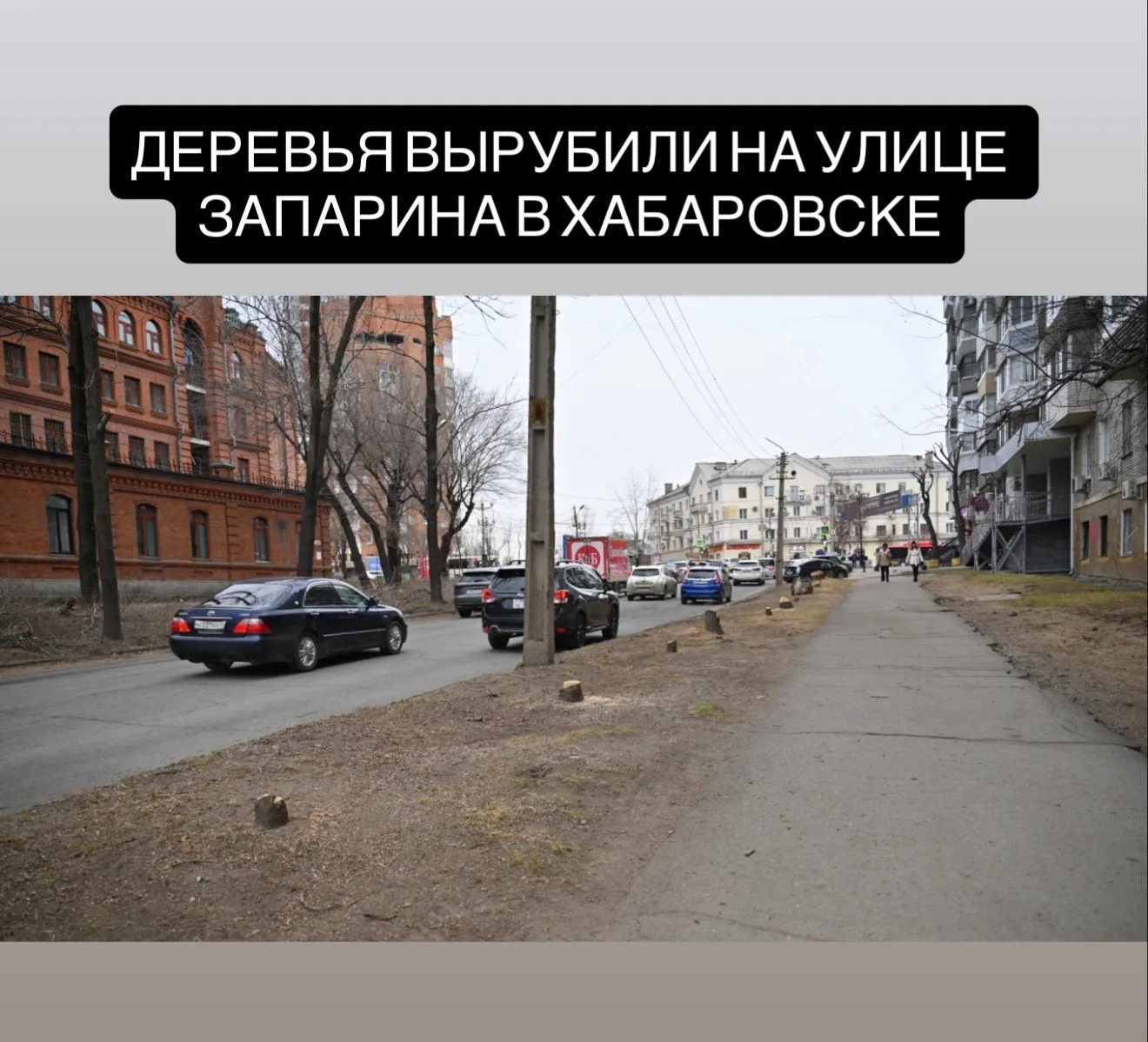 В Хабаровске на улице Запарина провели вырубку деревьев: вдоль дороги остались лишь пни и разбросанные ветви.
