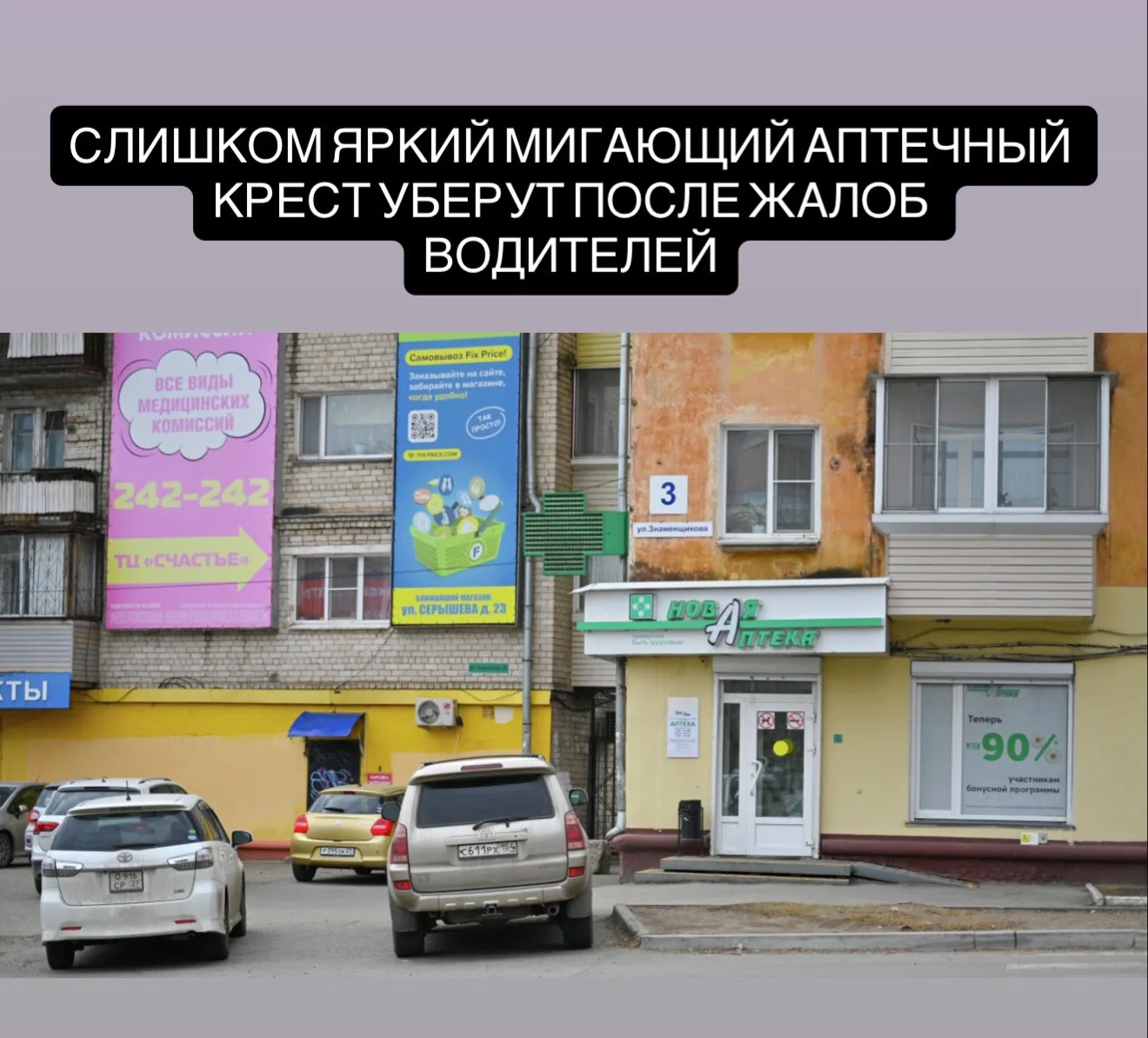 В Хабаровске жители пожаловались на яркий мигающий крест у аптеки на пересечении улиц Знаменщикова и Серышева. По их словам, подсветка слишком интенсивная и отвлекает водителей, особенно в тёмное время суток, создавая риск для безопасности движения.
