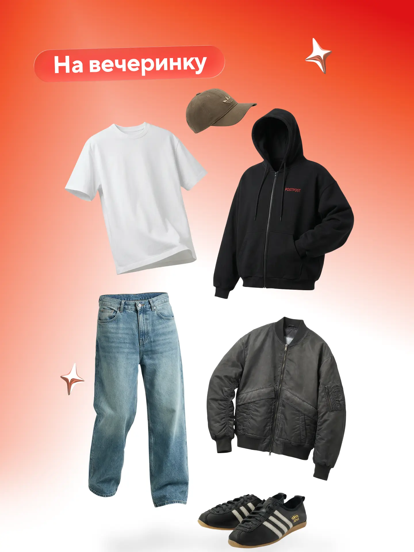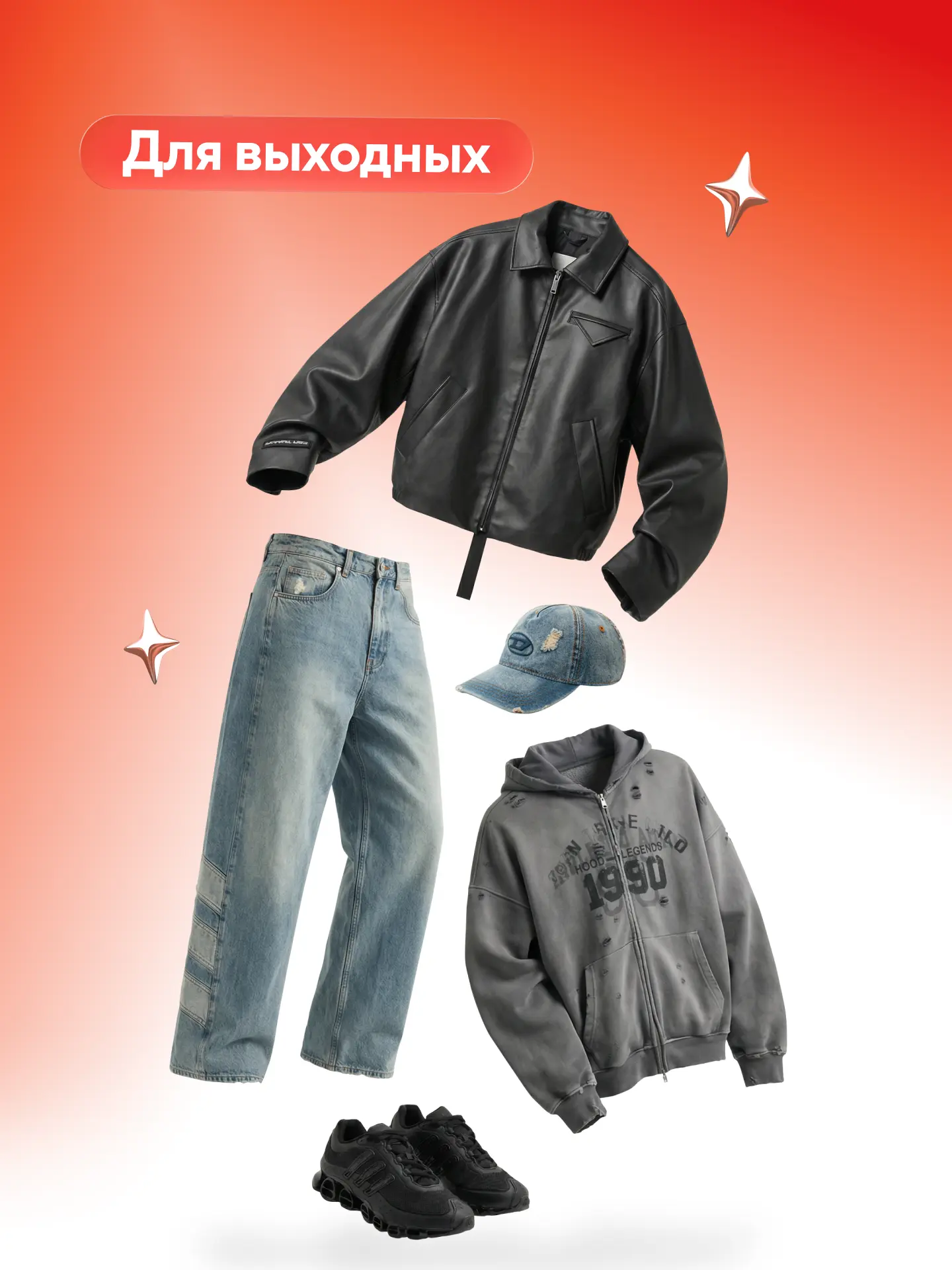 Для выходных: худи и джинсы, чтобы быть максимально расслабленным. Можно носить с кожаной курткой, кепкой с потёртостями и кроссовками.