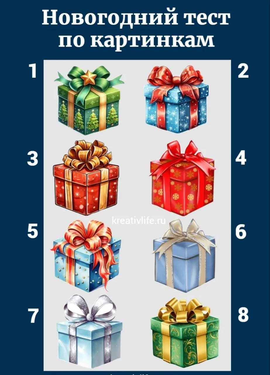 Перед вами восемь волшебных новогодних подарков. Каждый из них скрывает предсказание о том, что принесет вам наступающий год. Выберите тот подарок, который притягивает ваш взгляд сильнее всего, и узнайте, какой сюрприз приготовила для вас судьба.