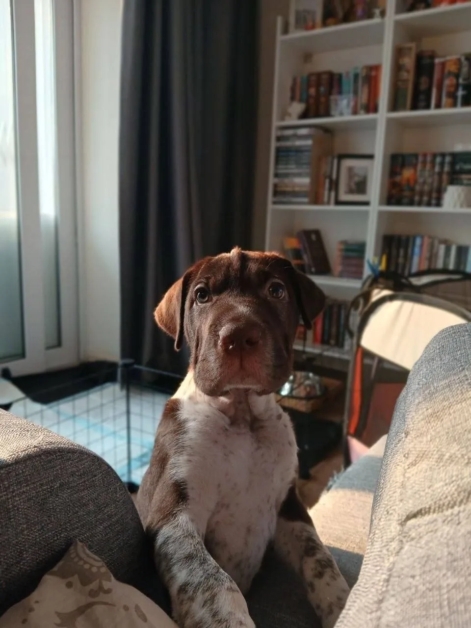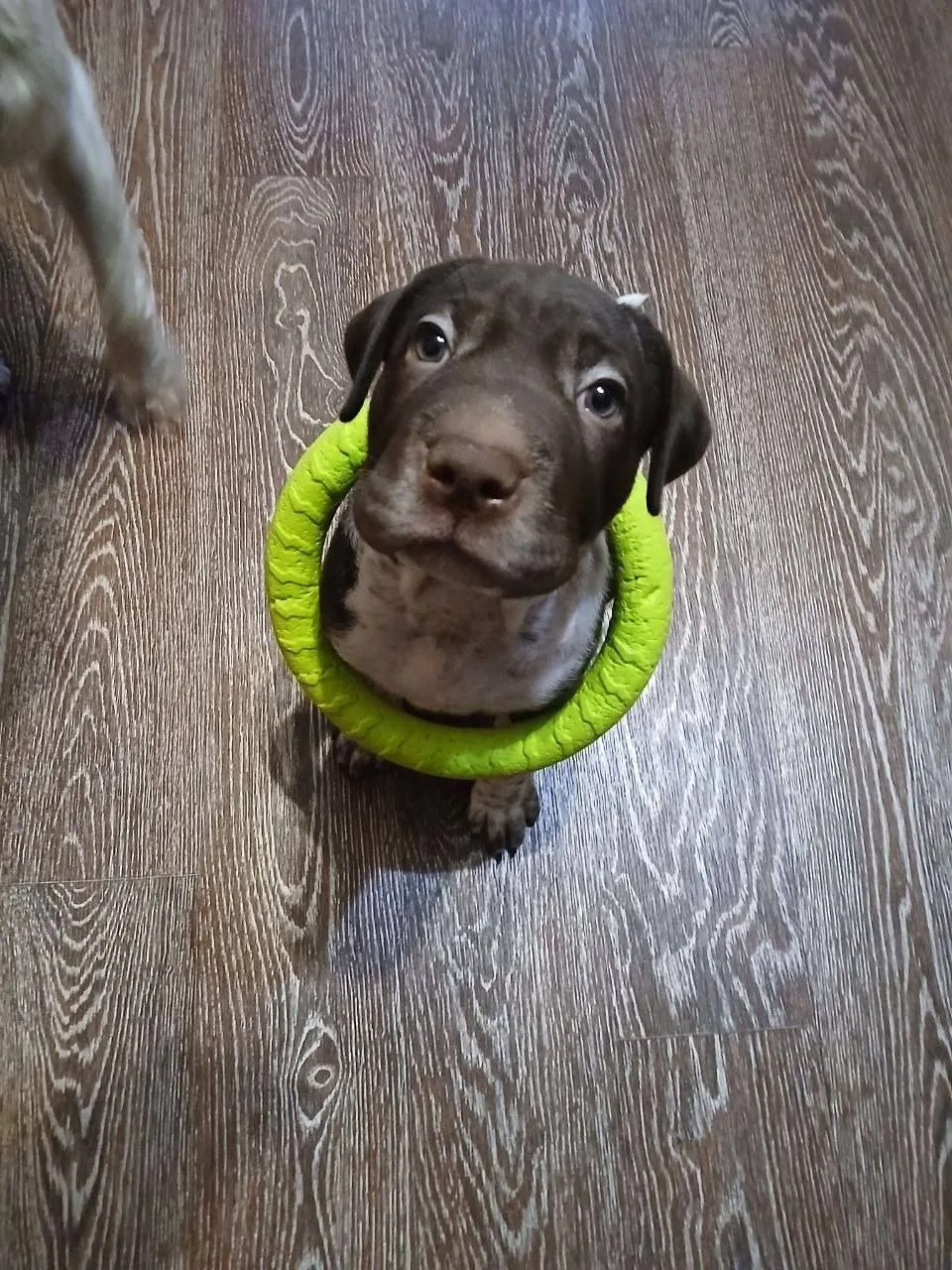 Так появилась Плюшка — маленькая, но сильная. Она окрепла, подросла и теперь живёт в любящей семье, учится командам и даже подружилась с кошкой.