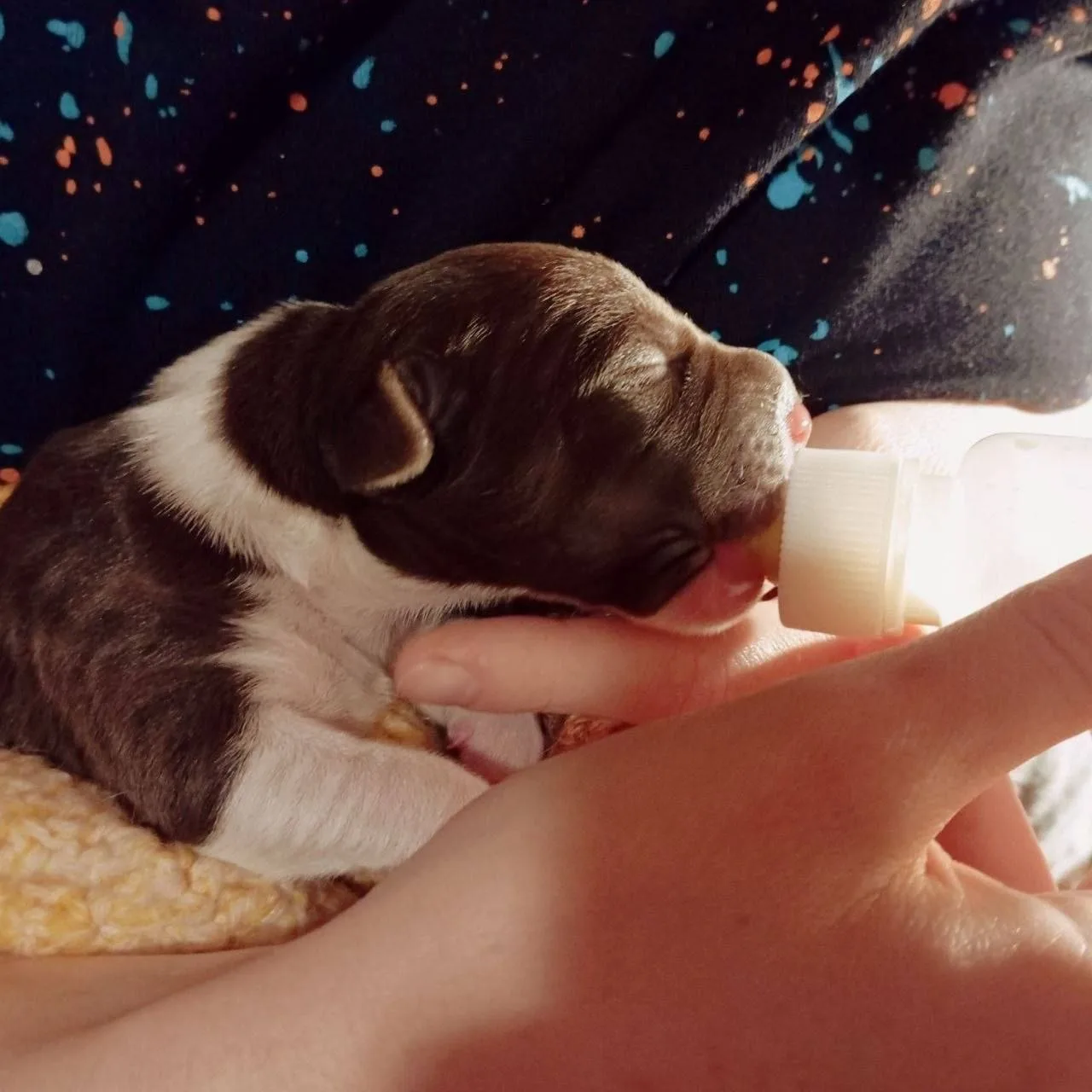 Дальше началась настоящая борьба за жизнь: суточного щенка забрали домой, выхаживали, кормили каждые два часа, лечили и буквально не отходили от него.