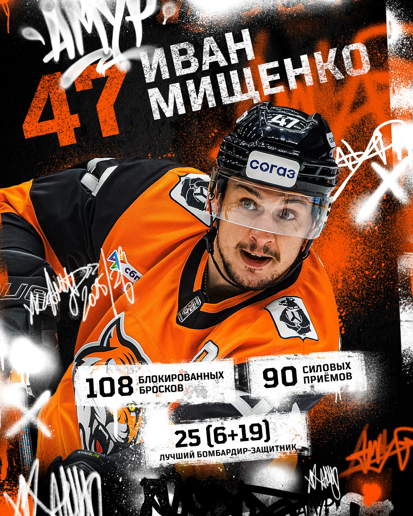Главные достижения: лучший бомбардир и снайпер среди защитников нашего коллектива, лидер команды по силовым приёмам и блокированным броскам. Ещё он делит первую строчку с Олегом Ли по количеству голевых передач. Как итог — лучший сезон в КХЛ!