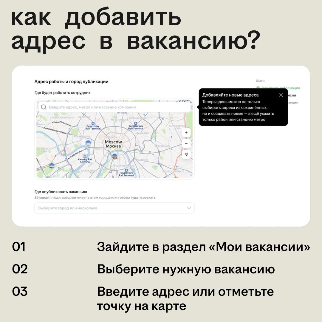 Добавить адрес можно в новую или в уже опубликованную вакансию. Нужно просто ввести адрес или поставить точку на карте.
