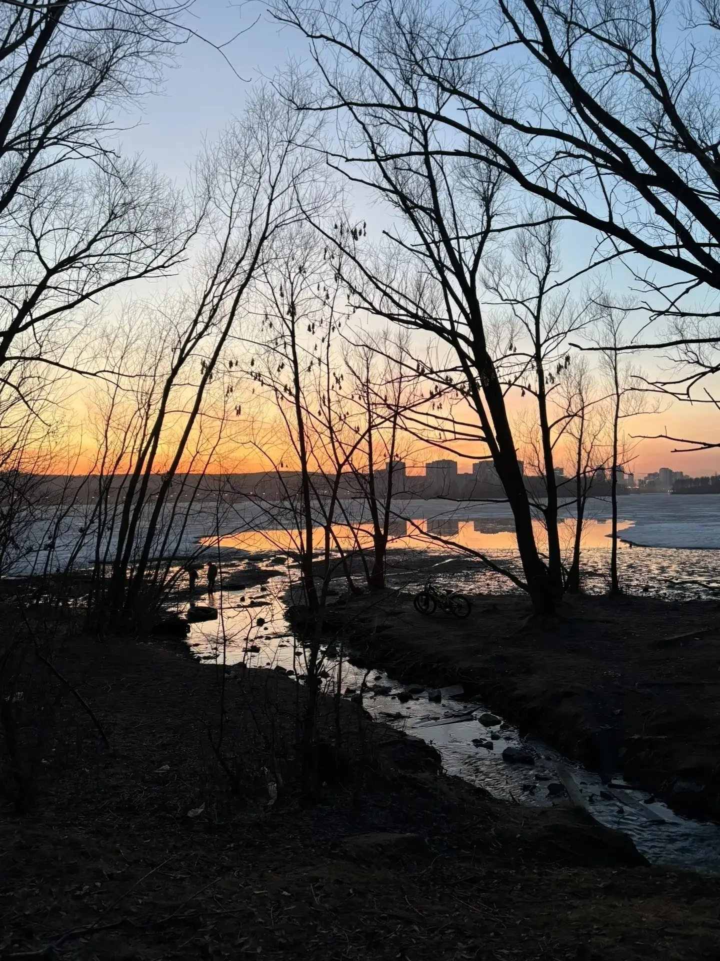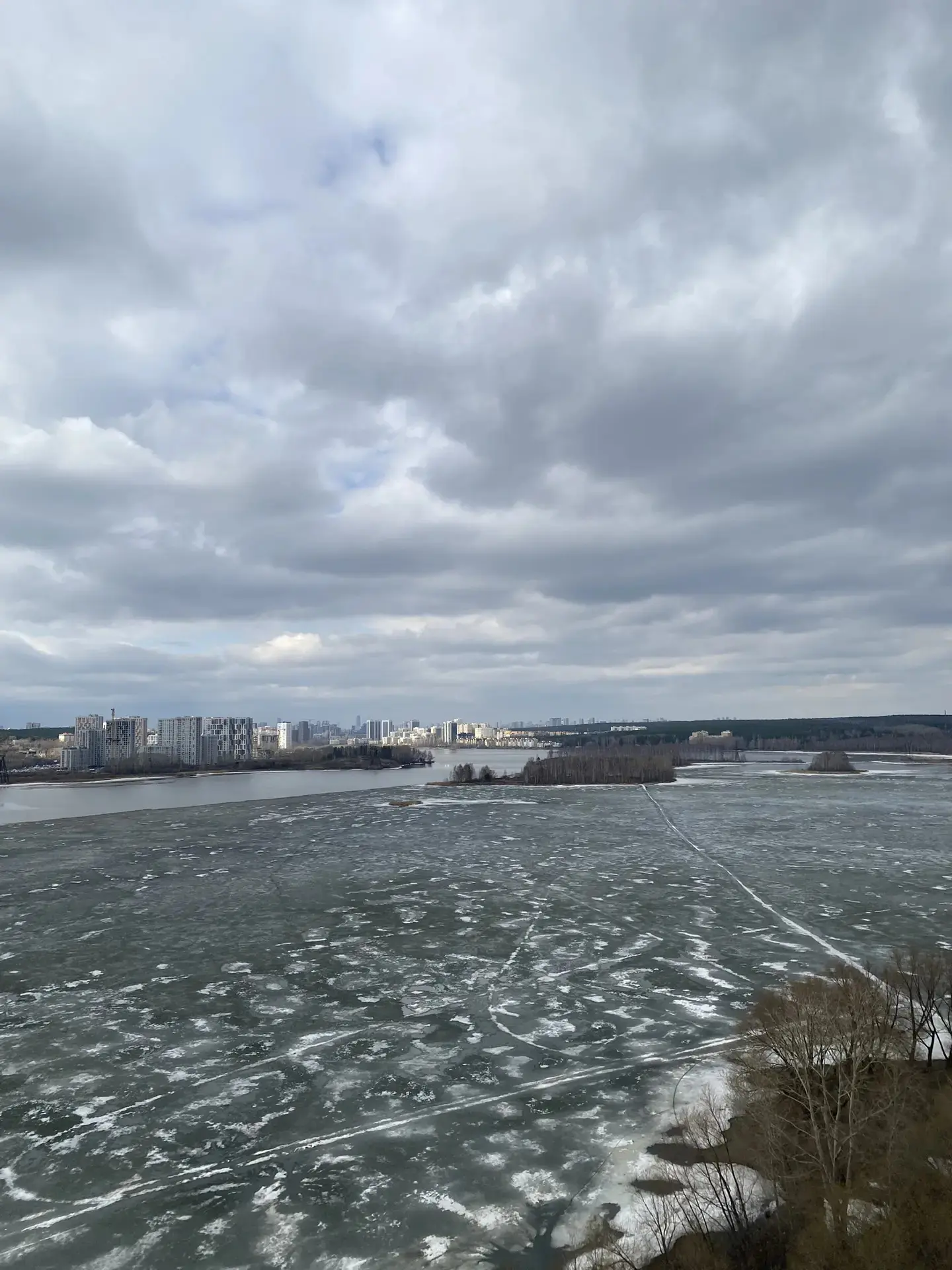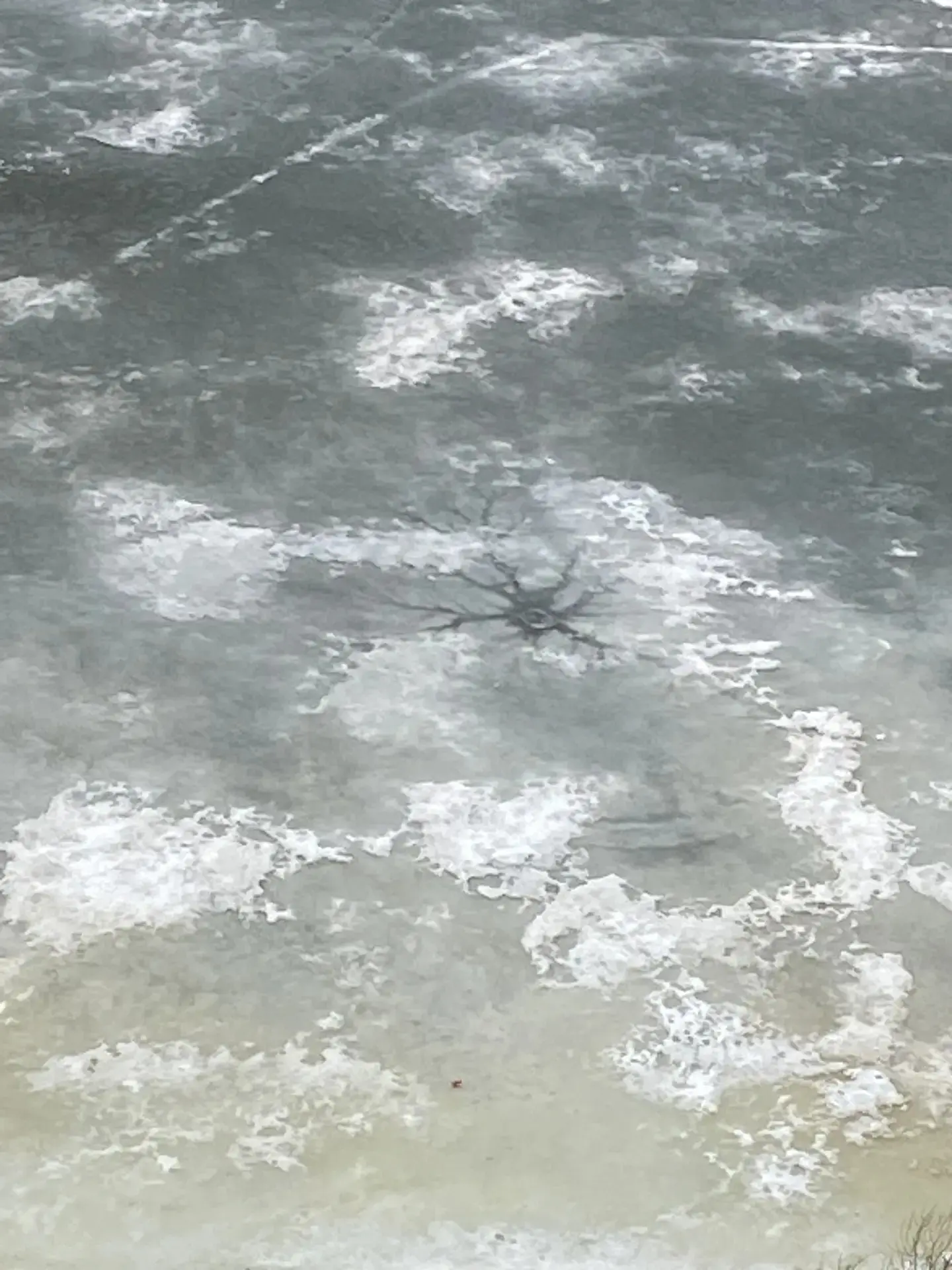 Вид на пруд с Профсоюзной, 43 и удивительное явление в тающем льду🤔 … какая-то каракатица, а в центре глаз…😁 🤷♀️ сфотографировала с высоты 14 этажа…