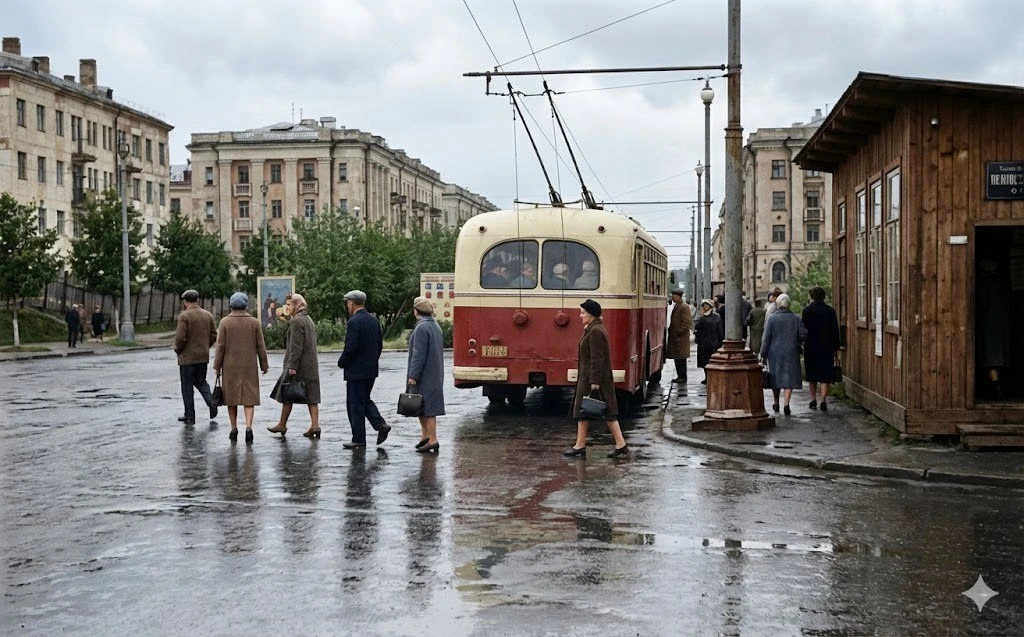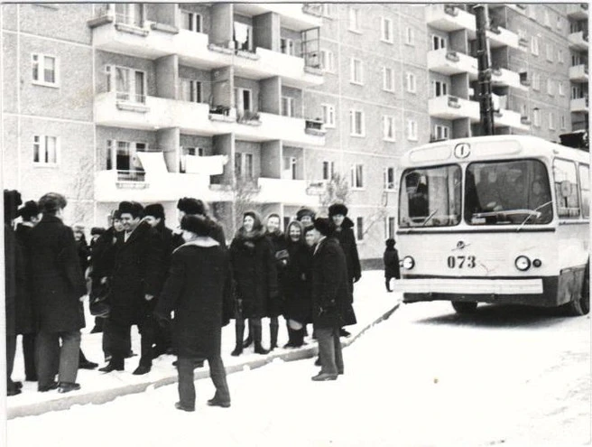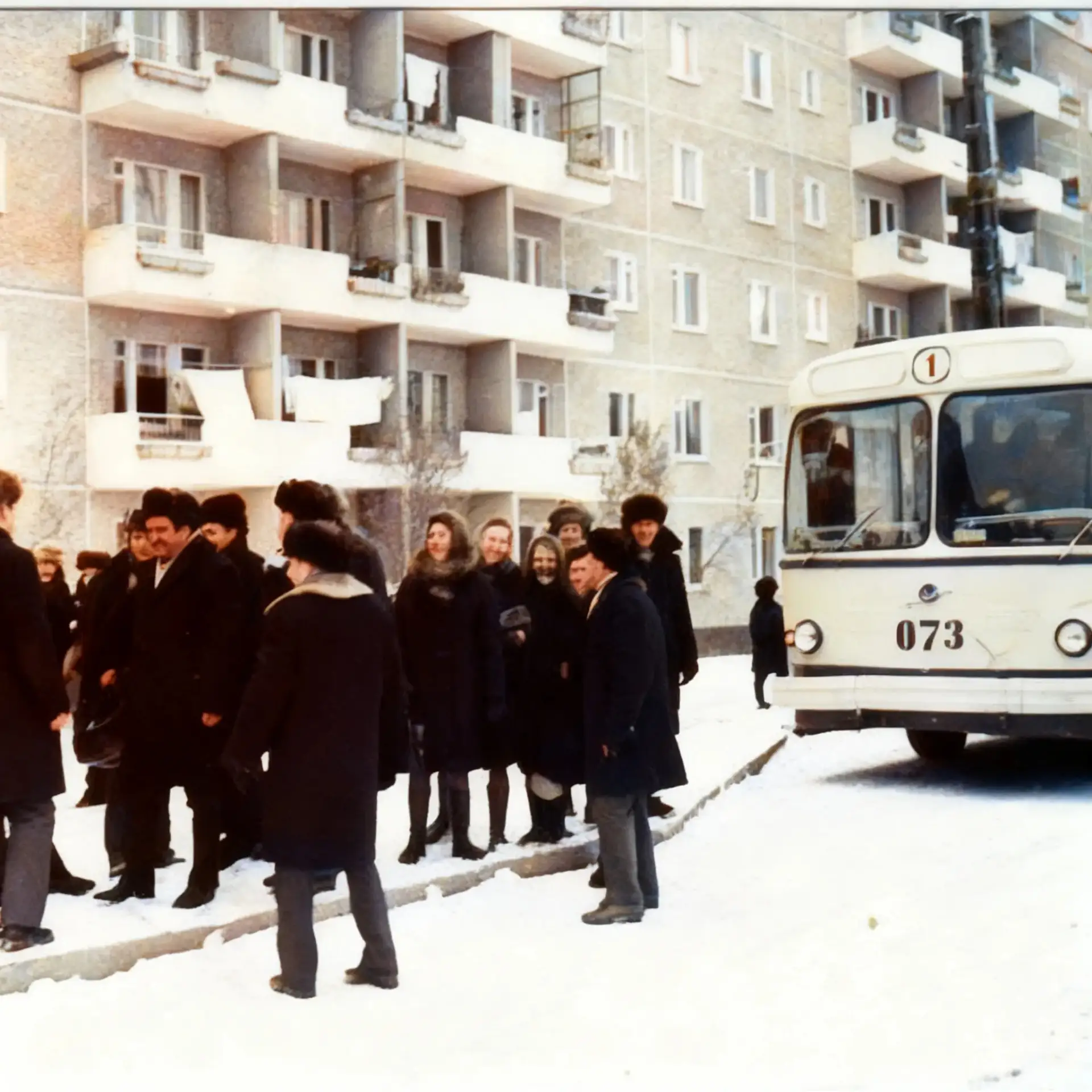 Группа советских граждан что-то очень весело обсуждает на троллейбусной остановке по улице Инженерная 1980 год.