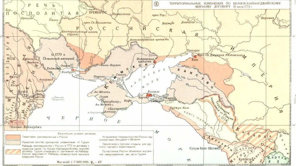 Поддерживаемые Францией и Австрией турки начали военные действия против России. По итогам этой войны (1768–1774) Турция потеряла Крым