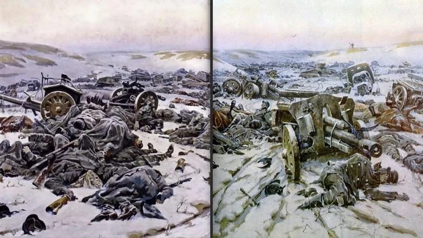 «Русские бились с особенным ожесточением»: они видели «испепеленные деревни и валявшиеся всюду по дорогам трупы убитых или замерзших крестьян, их жен и детей» (Тарле)