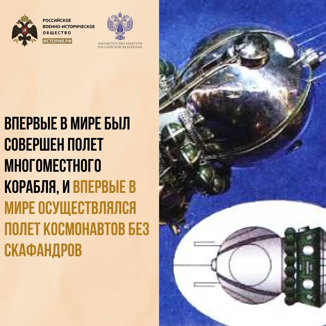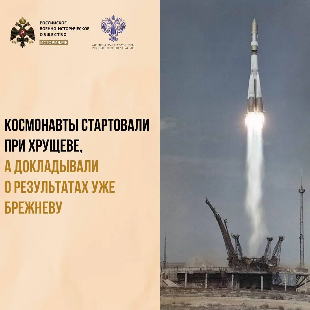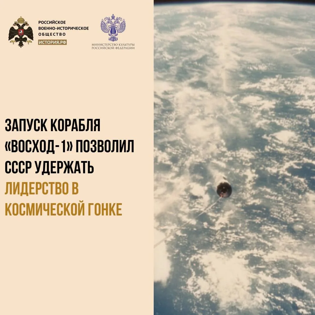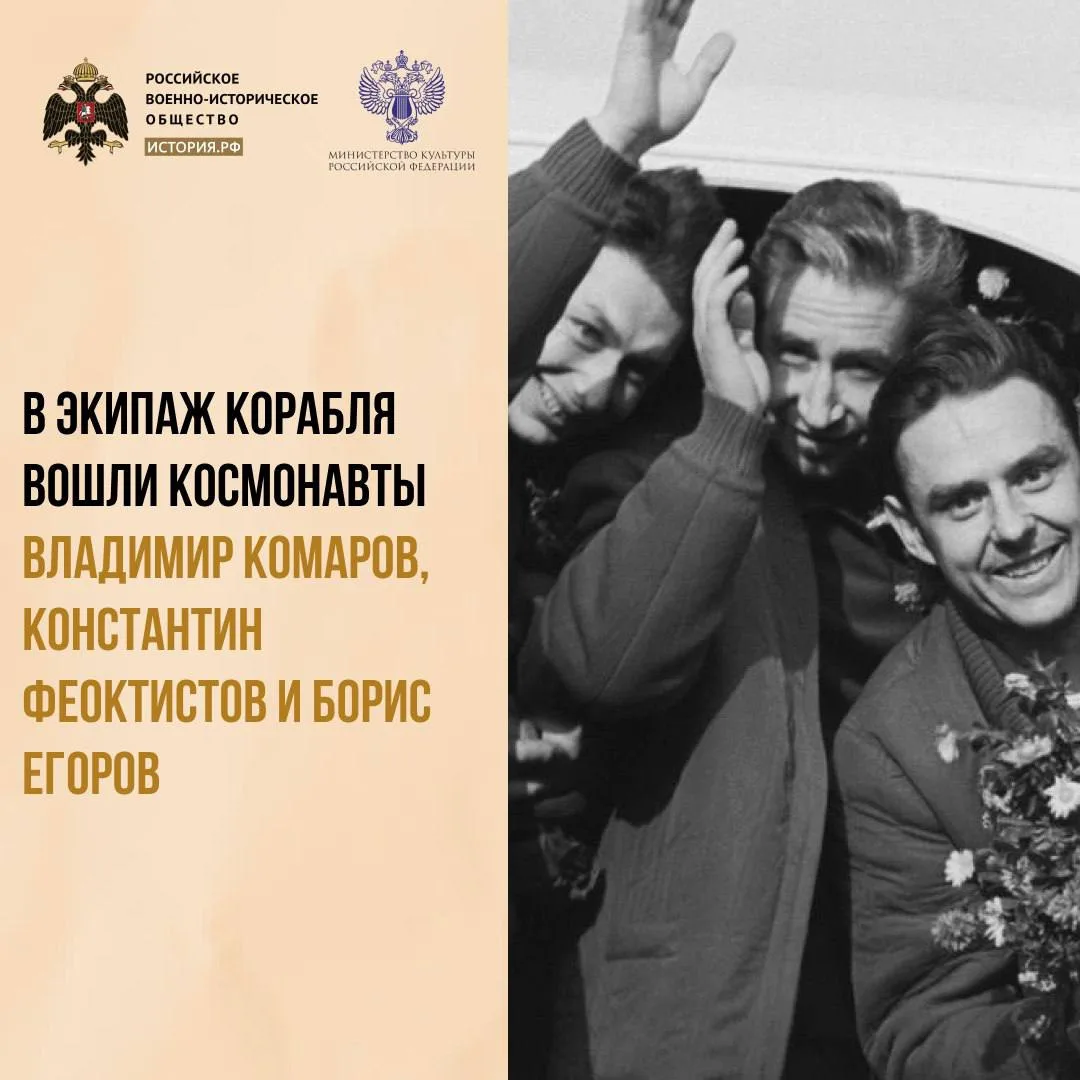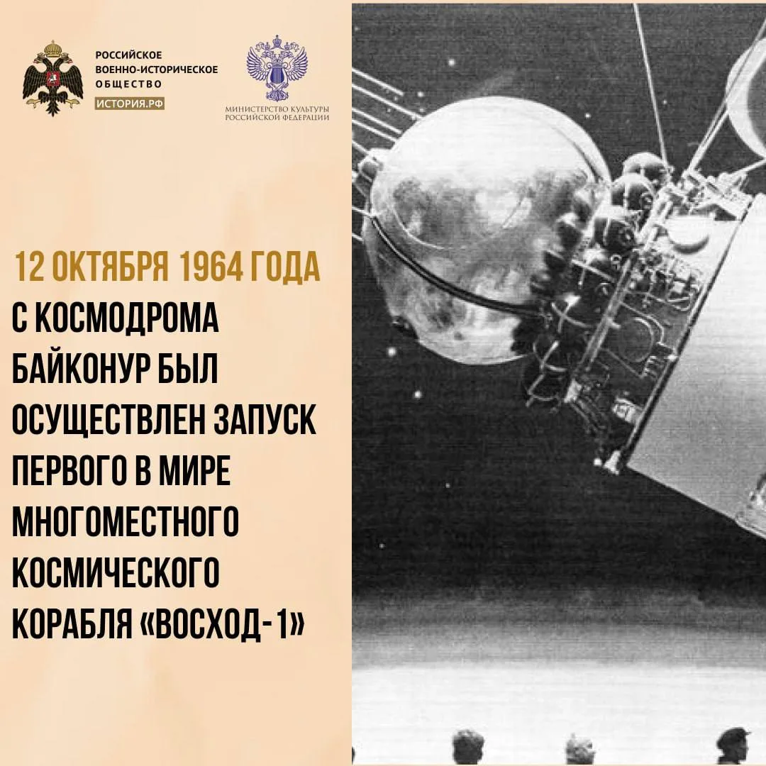 12 октября 1964 года с космодрома «Байконур» был осуществлен запуск советского пилотируемого космического корабля «Восход-1». В экипаж вошли командир Владимир Комаров, научный сотрудник Константин Феоктистов и врач Борис Егоров.
