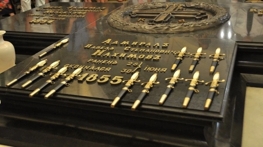 У Лазарева, Корнилова, Истомина, Нахимова общее надгробие в виде большого креста из черного мрамора