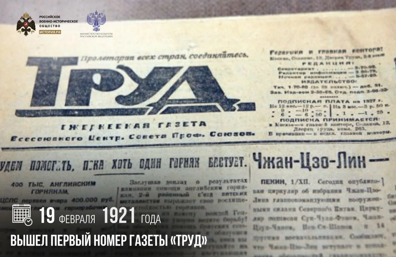 19 февраля 1921 года вышел первый номер газеты «Труд»