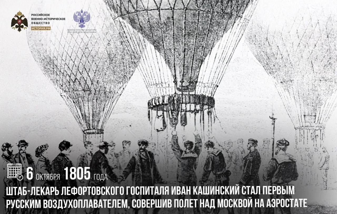 6 октября 1805 года штаб-лекарь Лефортовского госпиталя Иван Кашинский стал первым русским воздухоплавателем, совершив полет над Москвой на аэростате