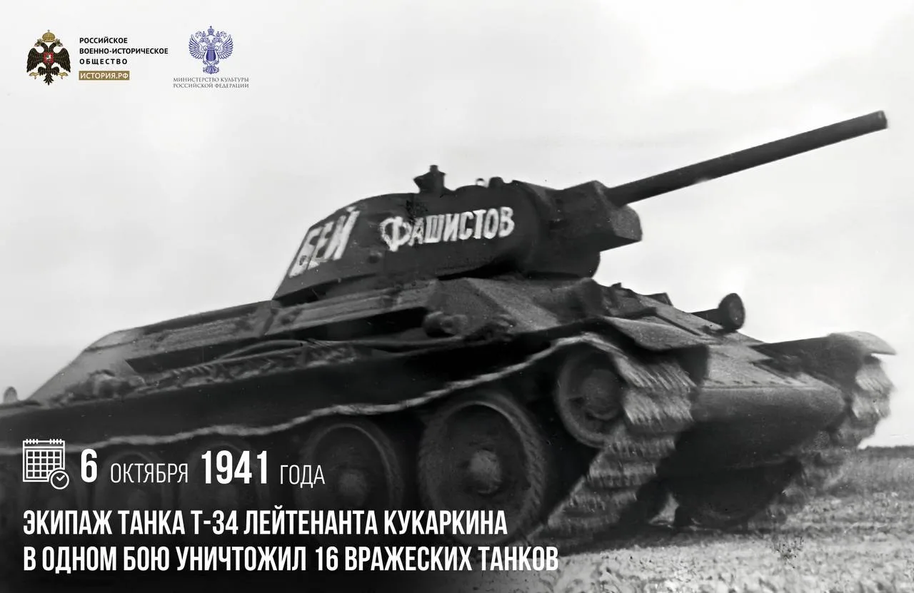 6 октября 1941 года экипаж танка Т-34 лейтенанта Кукаркина в одном бою уничтожил 16 вражеских танков