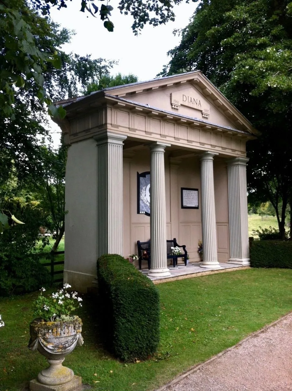 Принцессу похоронили в её родовом поместье Альторп на небольшом острове посреди Овального озера. Это место стало символом уединения и покоя, которого Диане так не хватало при жизни. На берегу озера был установлен мемориал — изящный памятник в дорическом стиле. Посетители могут оставить там цветы, записки и просто побыть в тишине, вспоминая "королеву людских сердец". Но сам остров, где покоится Диана, закрыт для посещения, чтобы сохранить атмосферу покоя.