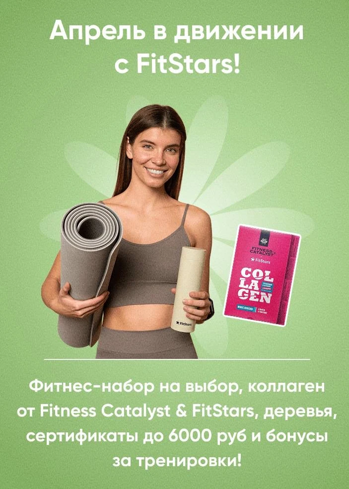 акция действует с 01.04.2026 по 30.04.2026. организатор акции, правила её проведения, количество подарков, сроки, место и порядок их получения — на сайте FitStars (раздел «Акции»).