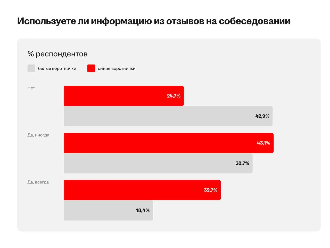 Чтение отзывов становится регулярной практикой. 80% соискателей считают их важной частью оценки работодателя. Средний показатель важности отзывов вырос с 4,2 в 2024 году до 4,3 в 2025 году. Количество тех, кто обсуждает отзывы на собеседовании, увеличилось с 11% до 23,8%.