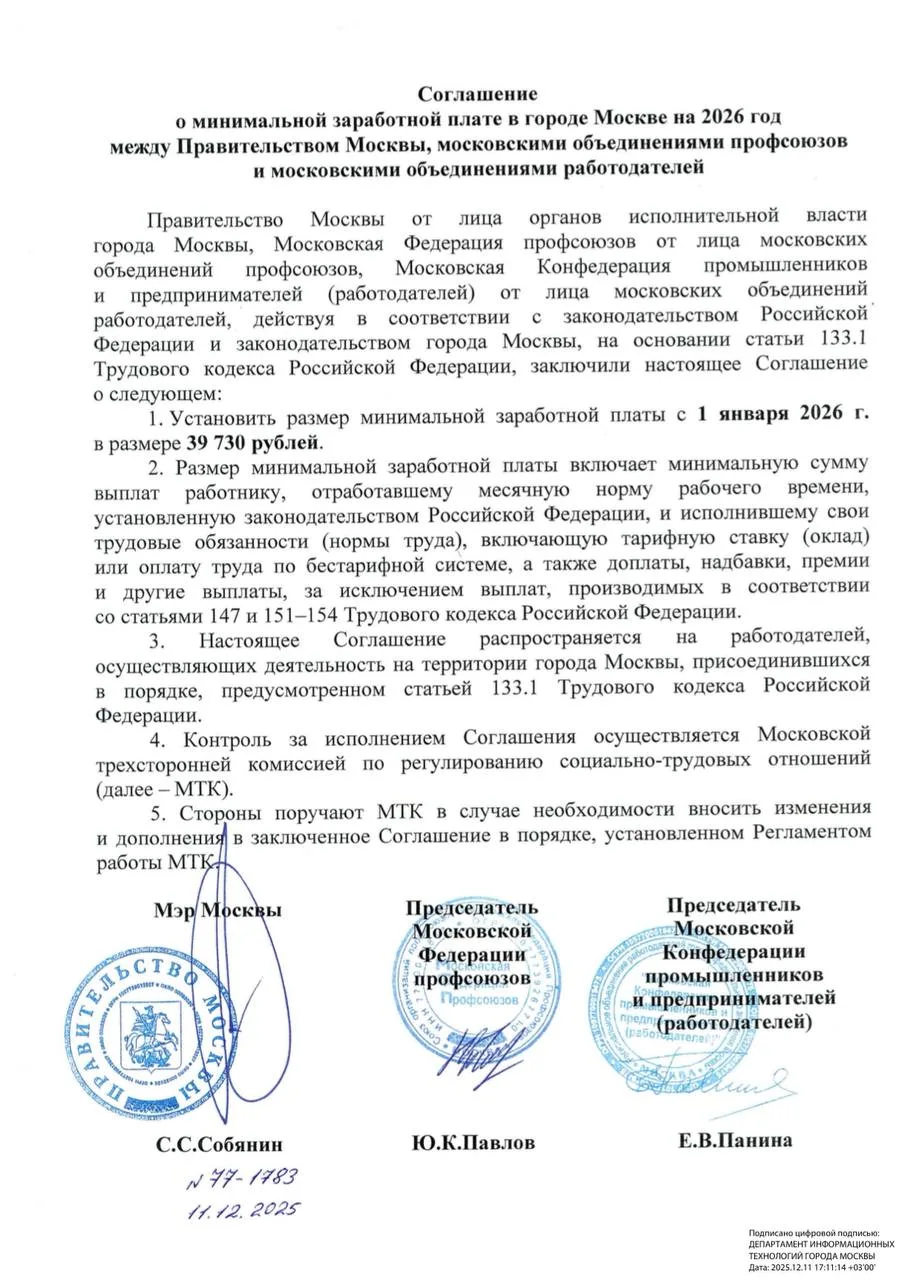С 1 января 2026 года МРОТ вырастет до 39 730 рублей. Соответствующее соглашение подписали городские власти, профсоюзы и объединения работодателей.