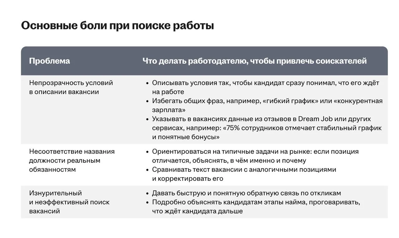 Согласно исследованию hh․ru и Dream Job, решение отозваться на вакансию формируется ещё до нажатия кнопки «Откликнуться». Соискатели сталкиваются с размытыми обязанностями, неполными описаниями и неточными названиями должностей, что заставляет их тратить больше времени на проверку компании и уточнение деталей.