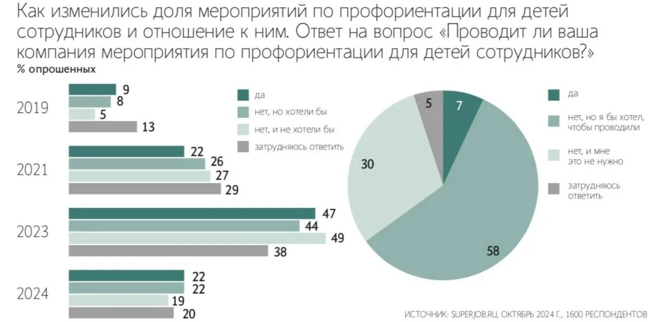 Доля работодателей, запускающих профориентационные программы, выросла с 5% в 2022-2023 гг. до 15% к концу 2024 года, отмечают в SuperJob. По данным HeadHunter, бенефиты чаще стали включать «семейные» бонусы.