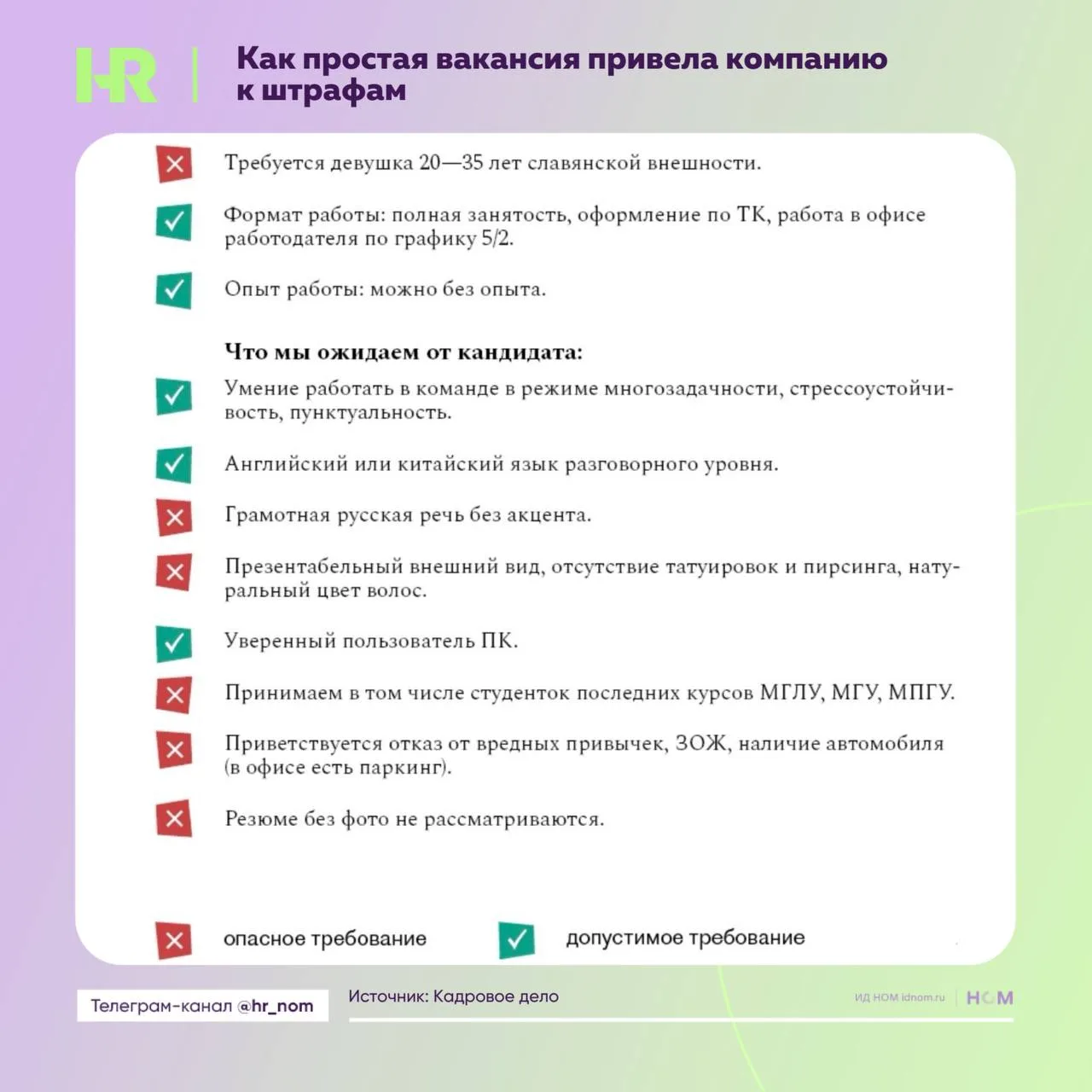 Даже если формулировки преподносятся как «желательно» или «предпочтительно», они создают преимущество для одних соискателей и ограничения для других и могут быть признаны дискриминационными. Впрочем, все мы ищем идеального кандидата, но если подходить к подбору гибко и беспристрастно, найти подходящего человека проще: внешние или материальные детали редко влияют на результаты, а ограничивающие формулировки заранее отсеивают много классных профессионалов.