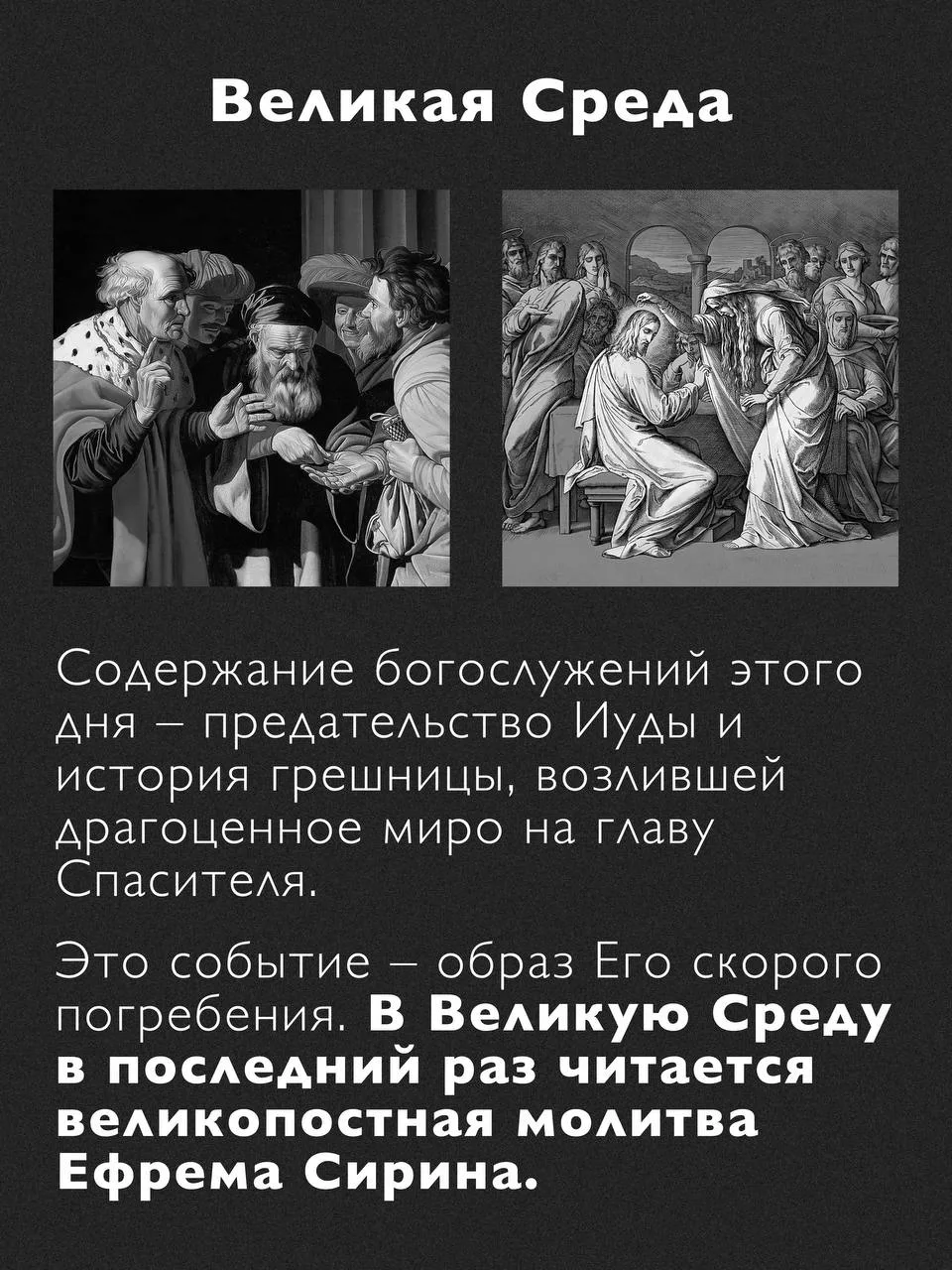 Великая Среда — день особый, наложивший отпечаток на весь церковный год. В среду всегда, кроме особых случаев, полагается пост — в память о предательстве Иудой Христа.