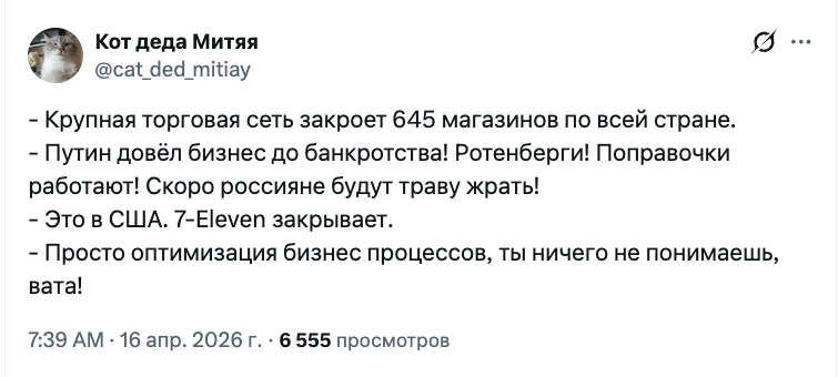 Если в новости будет "Пятёрочка закроет 1 магазин", хохлы и либерастня захлебнутся от радости в собственном говне с криками "Путин убивает бизнес".