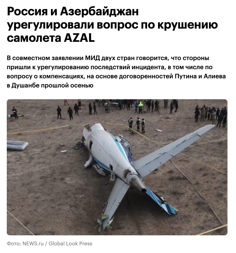 Министерства иностранных дел Азербайджана и России опубликовали совместное заявление, в котором сообщили, что пришли к урегулированию последствий в связи с крушением самолета Embraer 190 авиакомпании AZAL в 2024 году. Заявление опубликовали МИД Азербайджана и России.