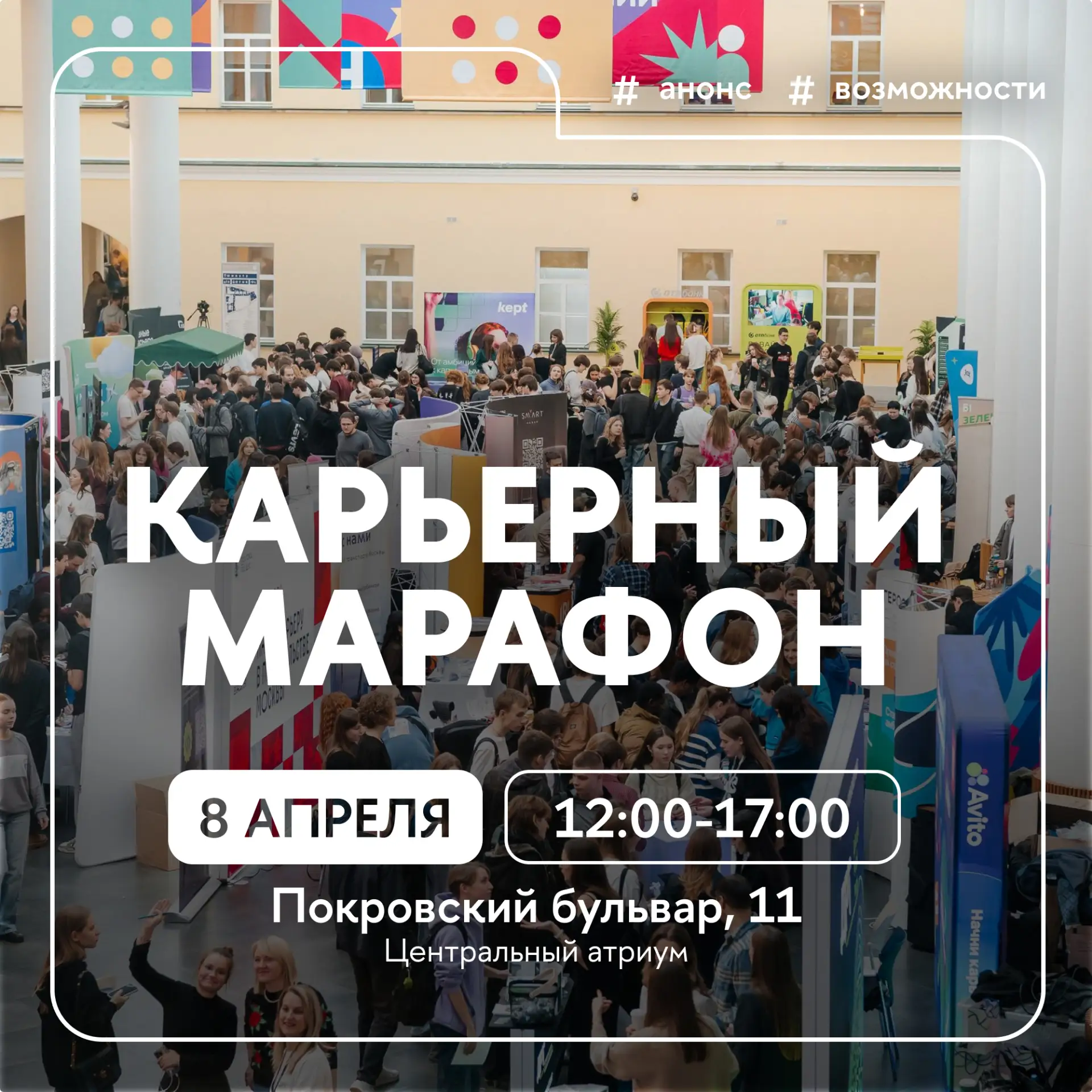 ✔️ 8 апреля с 12:00 до 17:00 на Покровке пройдет «Карьерный марафон». Участники смогут пообщаться с ведущими работодателями, узнать о стажировках, получить экспертные консультации и открыть новые горизонты для построения карьеры. Регистрация для внешних гостей