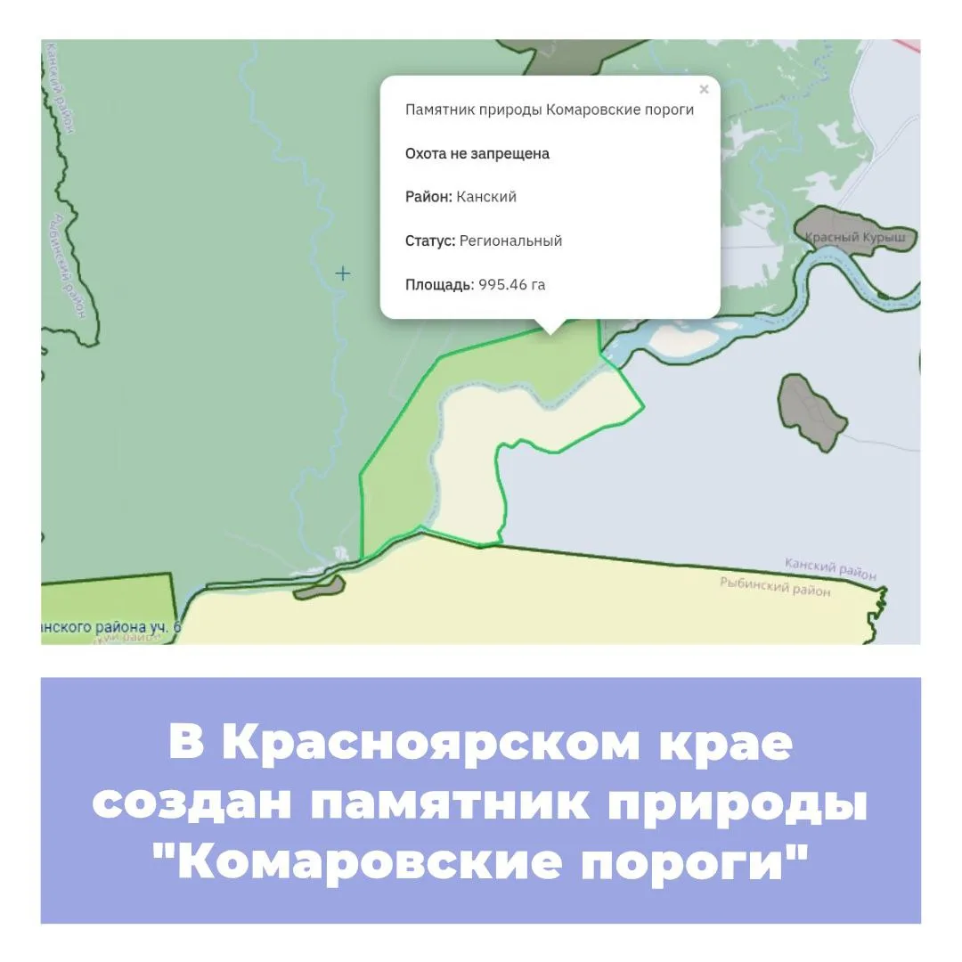 Постановлением Правительства Красноярского края от 11.11.2025 № 1016-п утверждены границы и режим особой охраны территории памятника природы краевого значения "Комаровские пороги". Режимом особой охраны охота не запрещена.