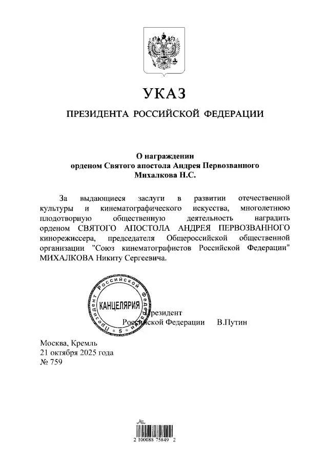 🇷🇺🇷🇺🇷🇺Президент России Владимир Путин наградил Никиту Михалкова орденом Святого апостола Андрея Первозванного