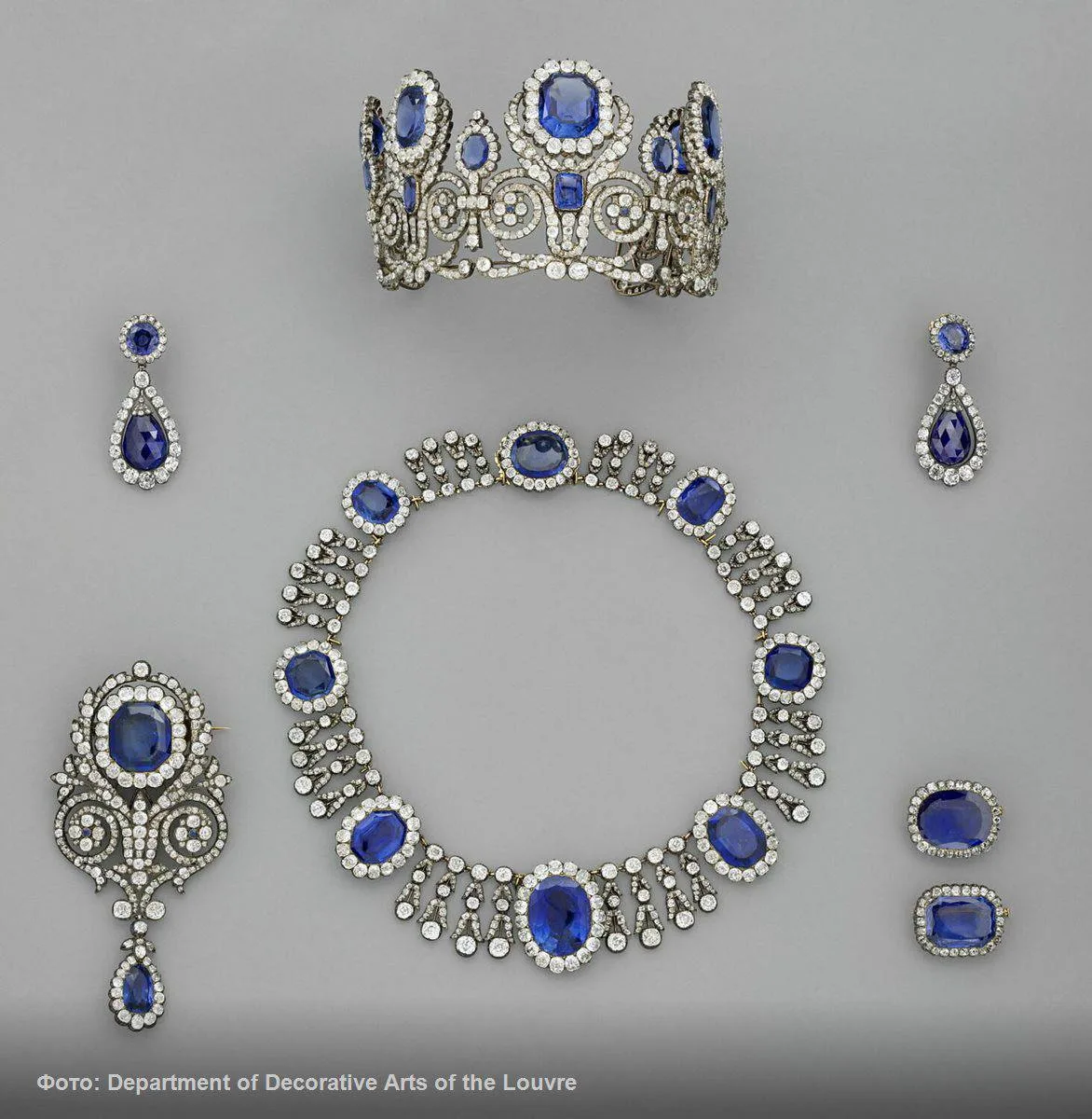 📍Диадема, ожерелье и серьги из сапфирового гарнитура королевы Марии-Амалии и Гортензии де Богарне. По семейному преданию, некоторые части этого ансамбля могли принадлежать королеве Марии-Антуанетте. Украшение переходило из поколения в поколение по линии Орлеанского дома до 1985 года, когда было приобретено государством.