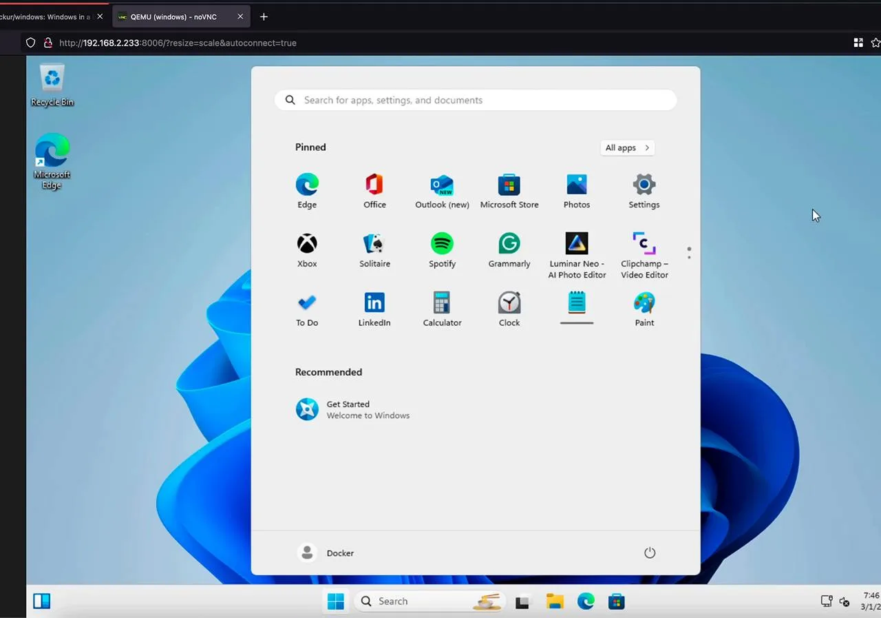 Операционная система в докер-контейнере (в QEMU) не требует ручной инсталляции ОС. Всего одна команда в консоли — и контейнер Windows скачивается и запускается.