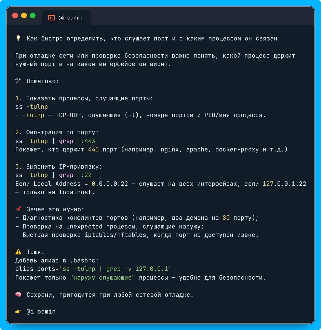 alias ports='ss -tulnp | grep -v 127.0.0.1'Покажет только "наружу слушающие" процессы — удобно для безопасности.