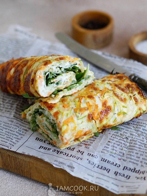 Натираем кабачок и морковь на крупной терке, смешиваем с тёртой моцареллой и яйцом, слегка солим и перчим. Выкладываем массу тонким слоем на пергамент в форме прямоугольника и запекаем при 190 градусах 20-25 минут. Готовую основу переворачиваем, снимаем пергамент, смазываем творожным сыром, добавляем соломку малосольных огурцов и рукколу, затем сворачиваем в рулет и нарезаем порционно.