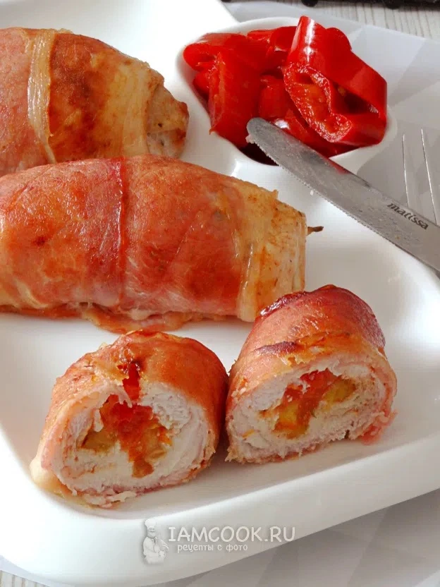 Вот она - закуска, перед которой меркнет вся банальщина. Получаются румяные рулетики с сочной начинкой, укутанные в бекон и запечённые до аппетитного хруста.