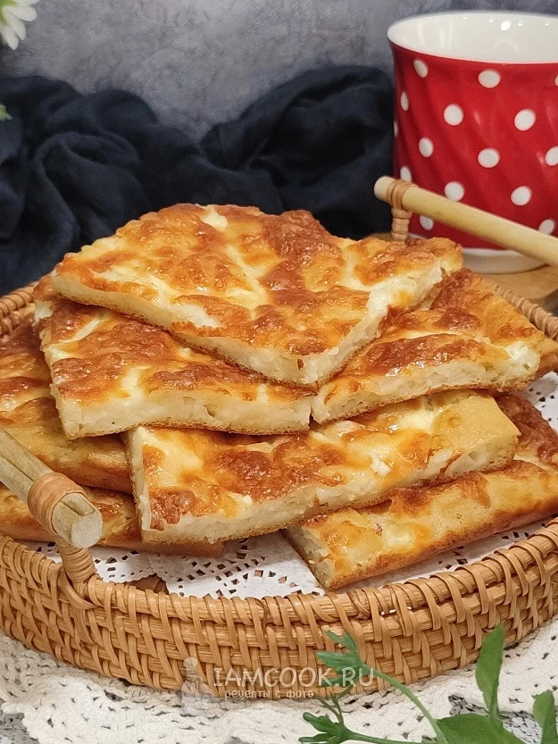 Смешиваем тёплый кефир с яйцами и растительным маслом, затем частями вводим муку, добавляем соль и соду и доводим тесто до консистенции густой сметаны. Выливаем всё тесто на противень 30x40 см, застеленный пергаментом. Сверху равномерно распределяем творог, натираем моцареллу на крупной тёрке и, если хочется, наносим сеточку майонеза. Выпекаем при 180 градусах 20-30 минут, а если верх румянится слишком быстро, снижаем температуру до 160 градусов. У нас пирог печётся 25 минут и получается нежным, сочным и с хорошей сырной корочкой.