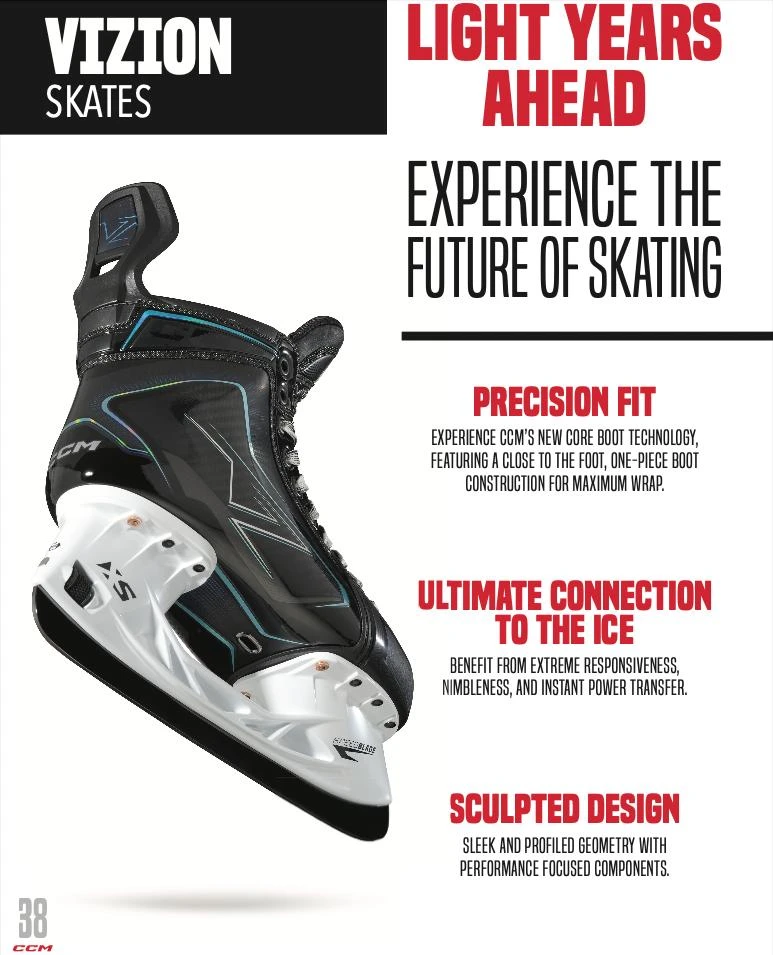 Будто в честь окончания хоккейного турнира на Олимпийских играх в сети появился скрин из каталога CCM, который, похоже, раскрывает финальный дизайн коньков Vizion. Эта утечка скорее подтверждает, что на одном из прошлых фото мы уже могли лицезреть почти полностью то, как будут выглядеть одни из самых ожидаемых коньков этого сезона. Кто-то говорил о излишней простоте, но я уверен, в реальности визуал будет на уровне: сегодня в дизайне часто расчет делается на игру света (особенно этот тренд заметен в коньках именно у CCM, которые делают их поверхность глянцевой).