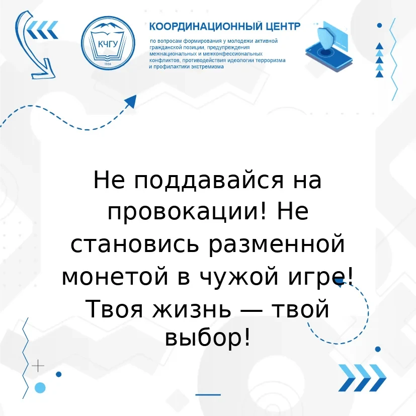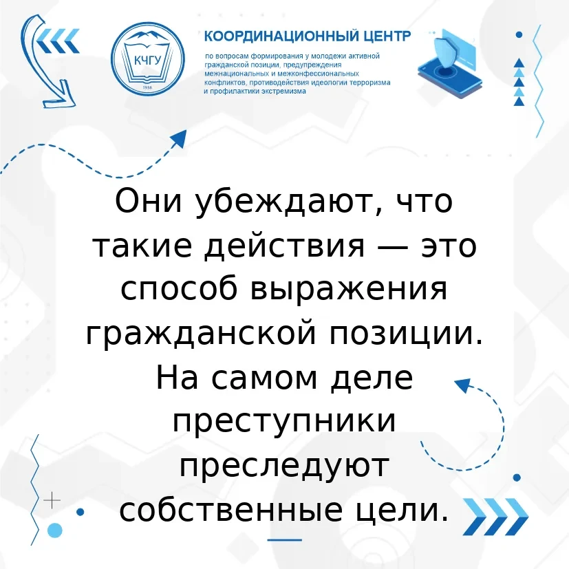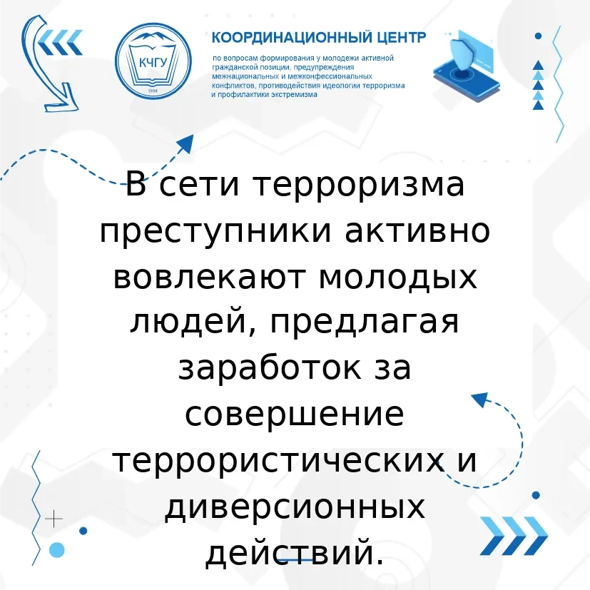 Зачем молодежь вовлекают в пособничество терроризму, кому это выгодно и к каким последствиям это может привести - в карточках, подготовленных Координационным центром по вопросам формирования у молодежи активной гражданской позиции, предупреждения межнациональных и межконфессиональных конфликтов, противодействия идеологии терроризма и профилактики экстремизма Карачаево-Черкесского государственного университета имени У.Д. Алиева.